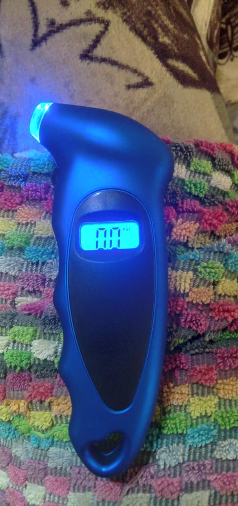 Nejlepší je, když je tryska kolem pozice 6 nebo 7 hodin, abyste mohli pevně stisknout měrku přímo dolů. To znamená, že musíte trochu natáhnout hlavu, abyste přečetli digitální měření, ale důležité je, abyste byli schopni přitlačit přímo a silně na hubici pneumatiky.