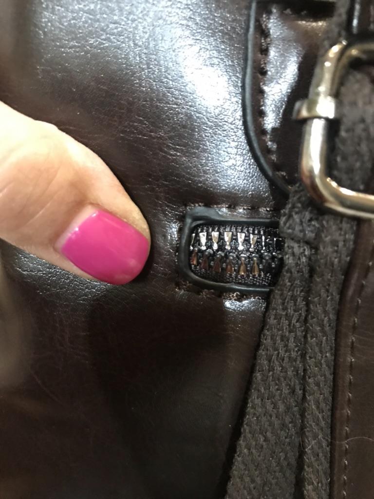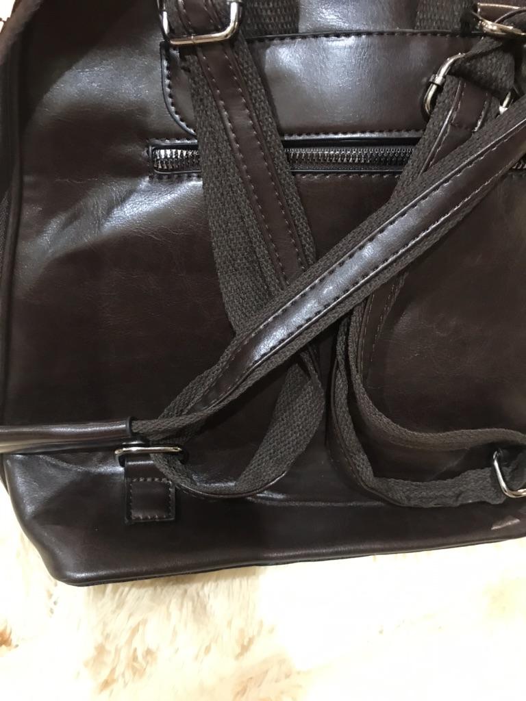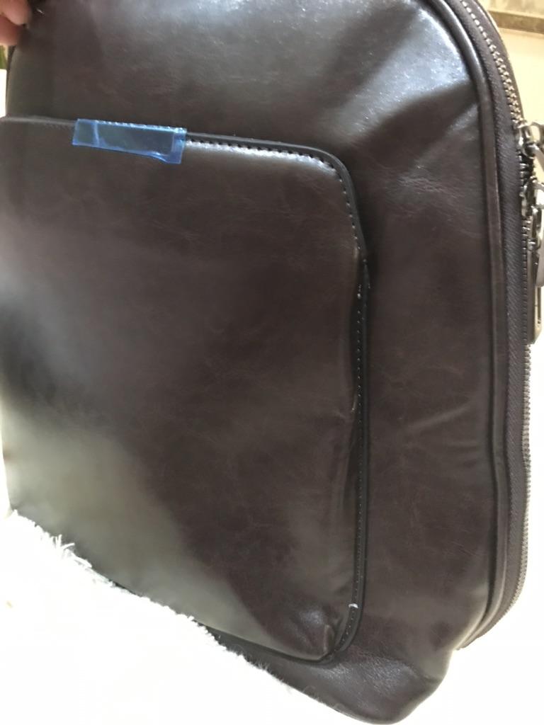 Nevím, jestli je to pravá kůže, protože švy jsou zatavené. Vypadá úhledně, drží tvar, je lehký. Dá se nosit na zádech, ale i jako taška přes jedno rameno.