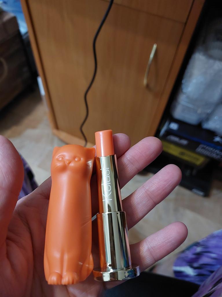 Mírně mastný, dobře zvláčňuje rty. Vůně je velmi chutná - jahodová. Balzámek na rtech je bezbarvý. A pouzdro je sen milovníků koťátek.:) Vzala jsem ještě černé a bílé koťátko jako dárek.