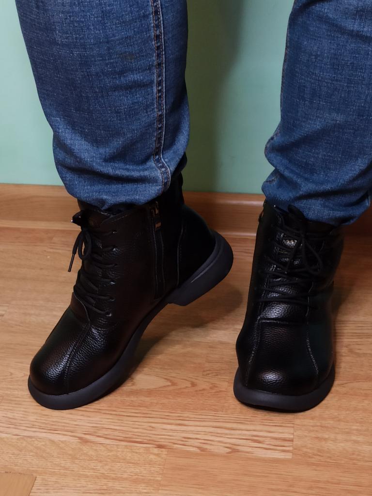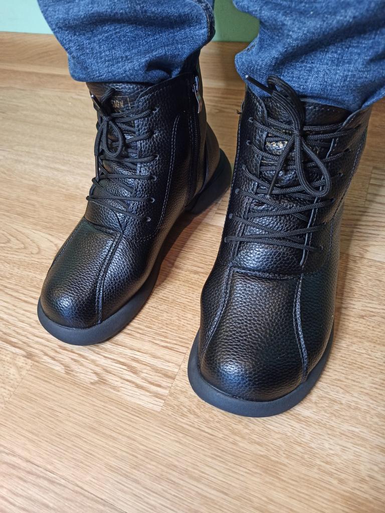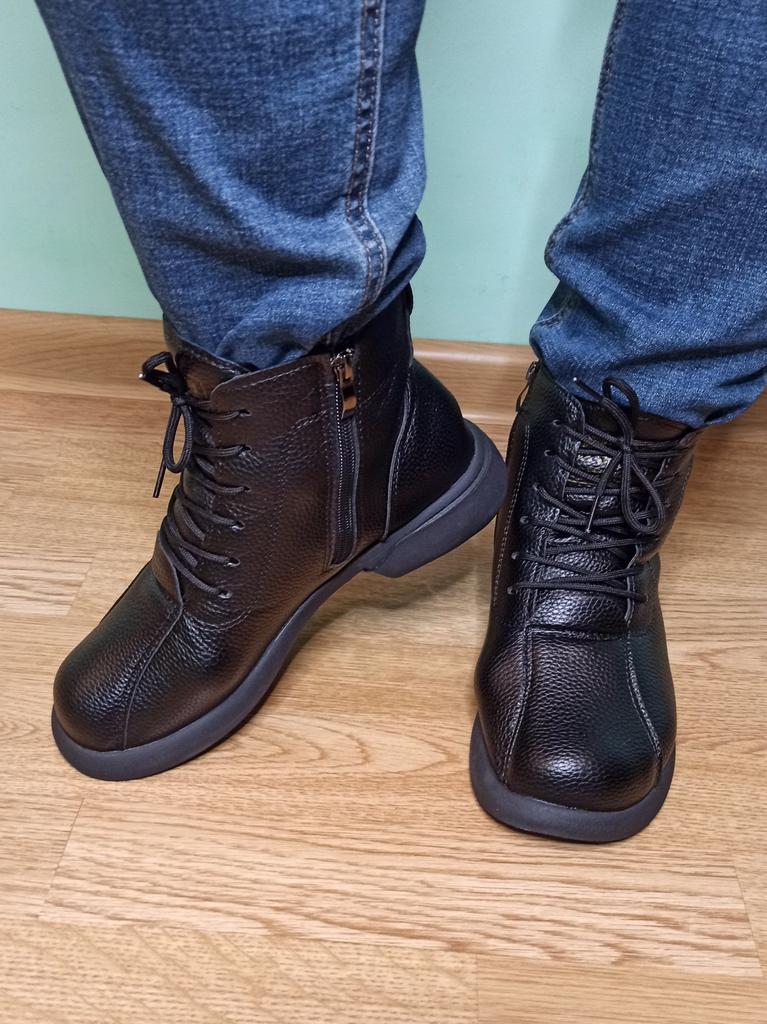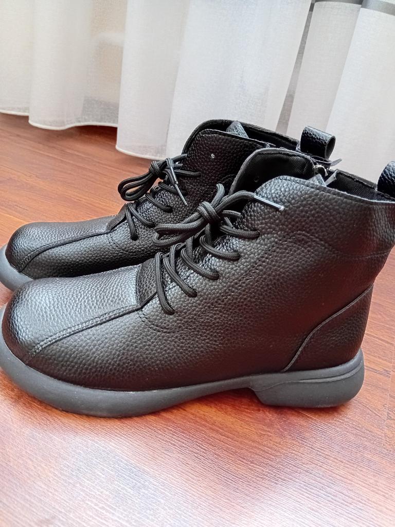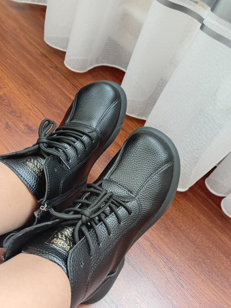 Dámské boty. Dvě barvy na výběr. Velikostní řada od velikosti 35 do velikosti 40. Pro délku chodidla 24,5 cm s problematickým chodidlem s kostí jsem objednala velikost 40, seděly skvěle.. Jsou kvalitně ušité, zapínají se na zip a mají šňůrky, pomocí kterých lze boty regulovat podle objemu nohy.. Eko kůže měkká, v oblasti špičky a paty zpevnění. Na noze vypadají úhledně. Hodím se na přechodné období. Přišly dobře zabalené bez cizího zápachu. Doporučuji koupit.