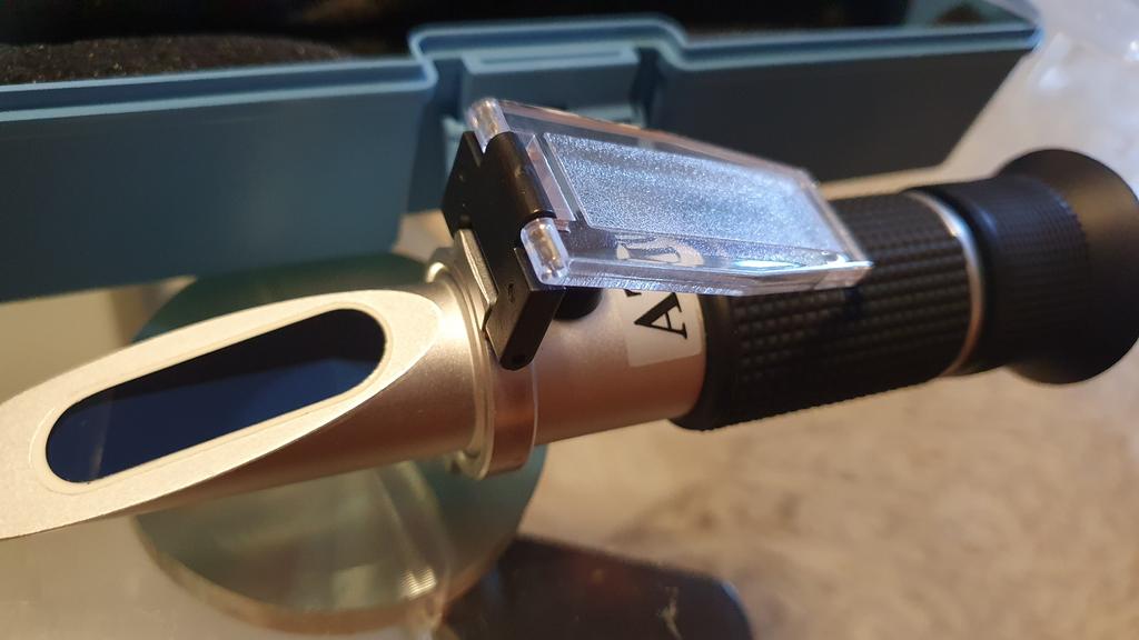 3. Clean the prism with soft cloth, then place 2-3 drops of the liquid sample to be tested on the prism.then close the cover plate and make sure the water spread aross the prism without any air bubbles or dry spots. wait for about 30 seconds to let the reading to stabilize. Align the prism assembly with the light source. look into eyepiece and you can get the reading.