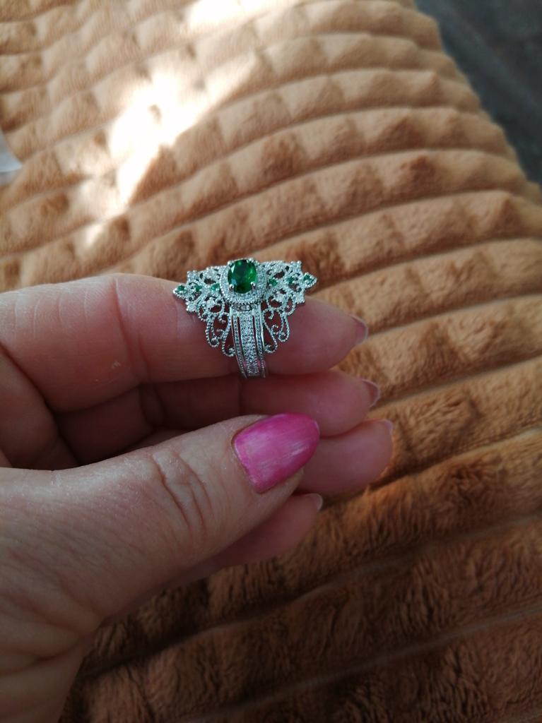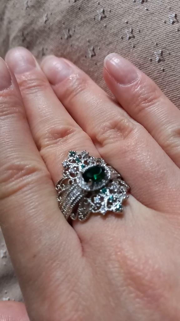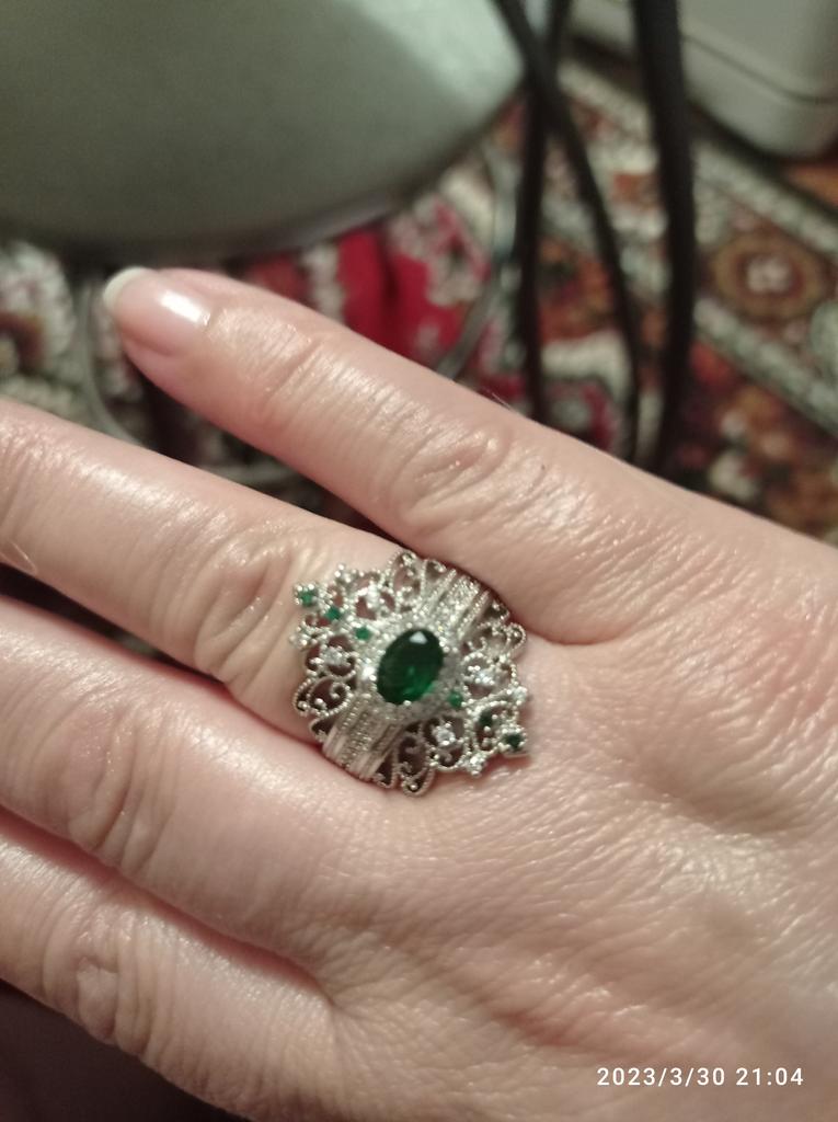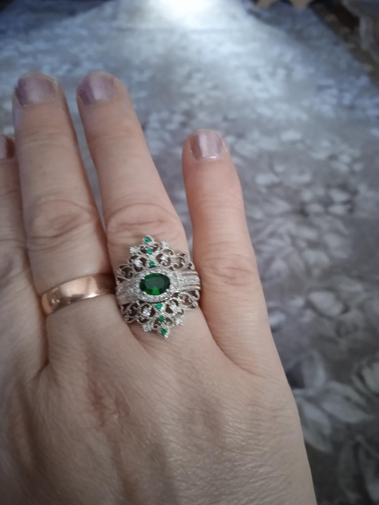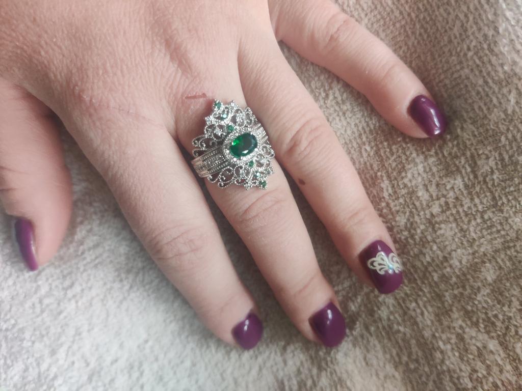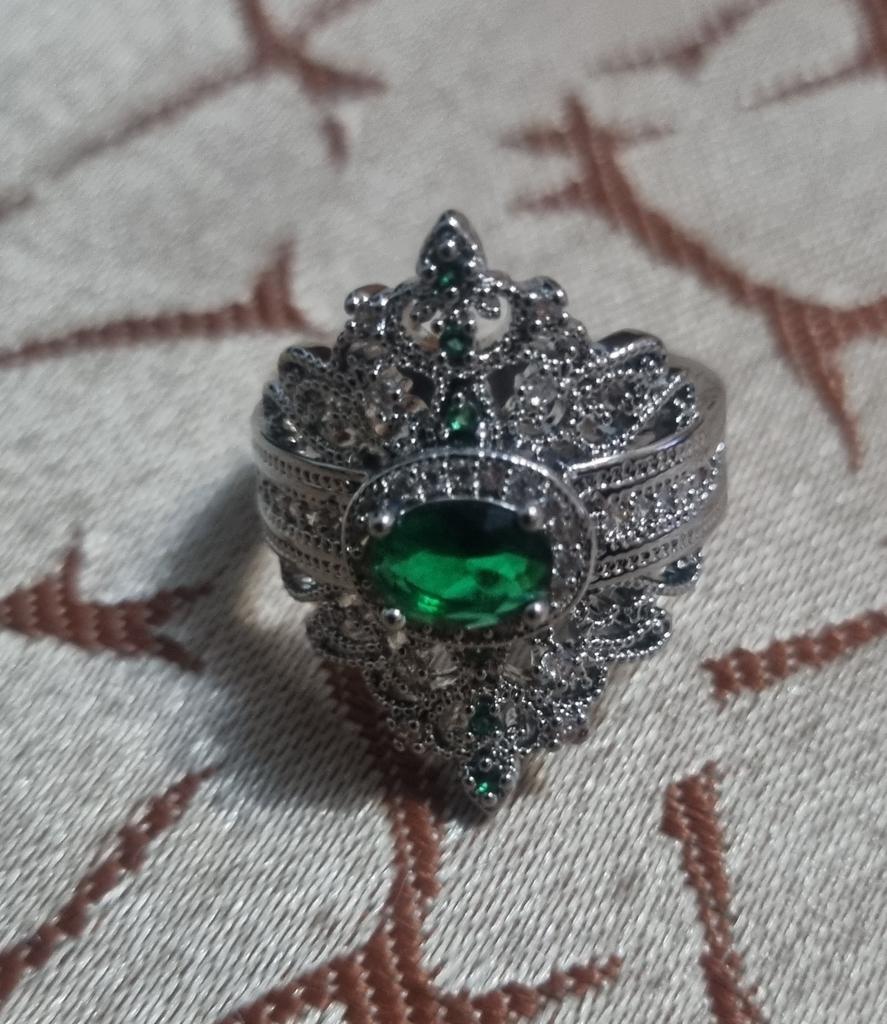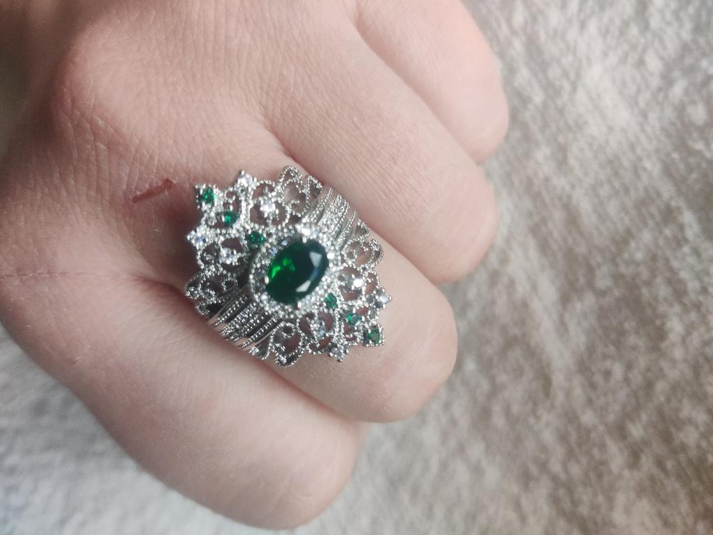 A massive ring in the form of a crown, it looks vintage, as if from the casket of a great-grandmother - a duchessπ€. I am satisfied with the quality, the color of the stone is deep green, emerald. I ordered size 7, it fit. Attracts attention, sparkles beautifully due to tiny rhinestones. It looks really royal. However, due to its pomp, you can wear it with something classic, evening.