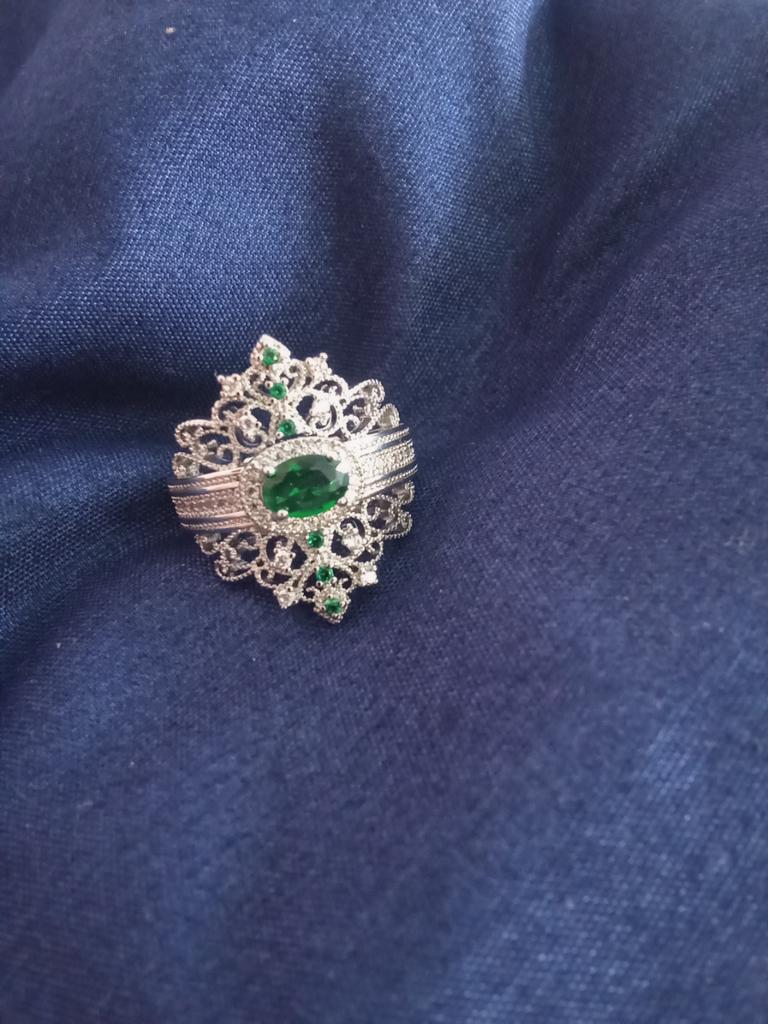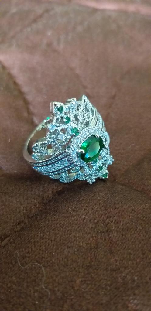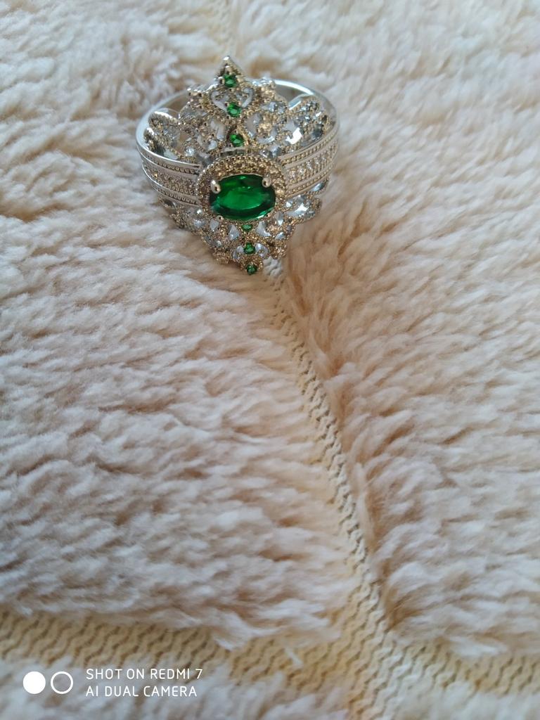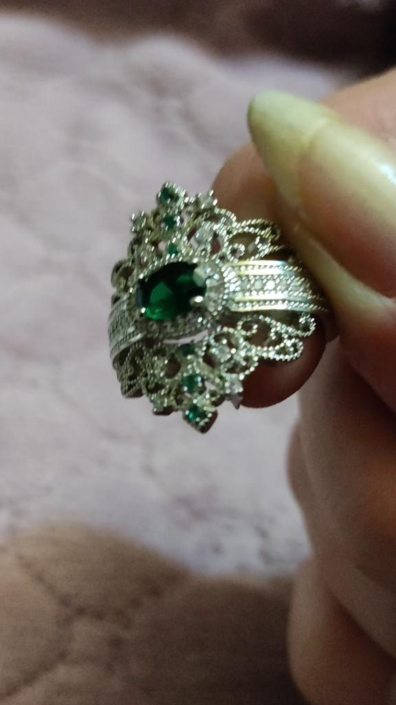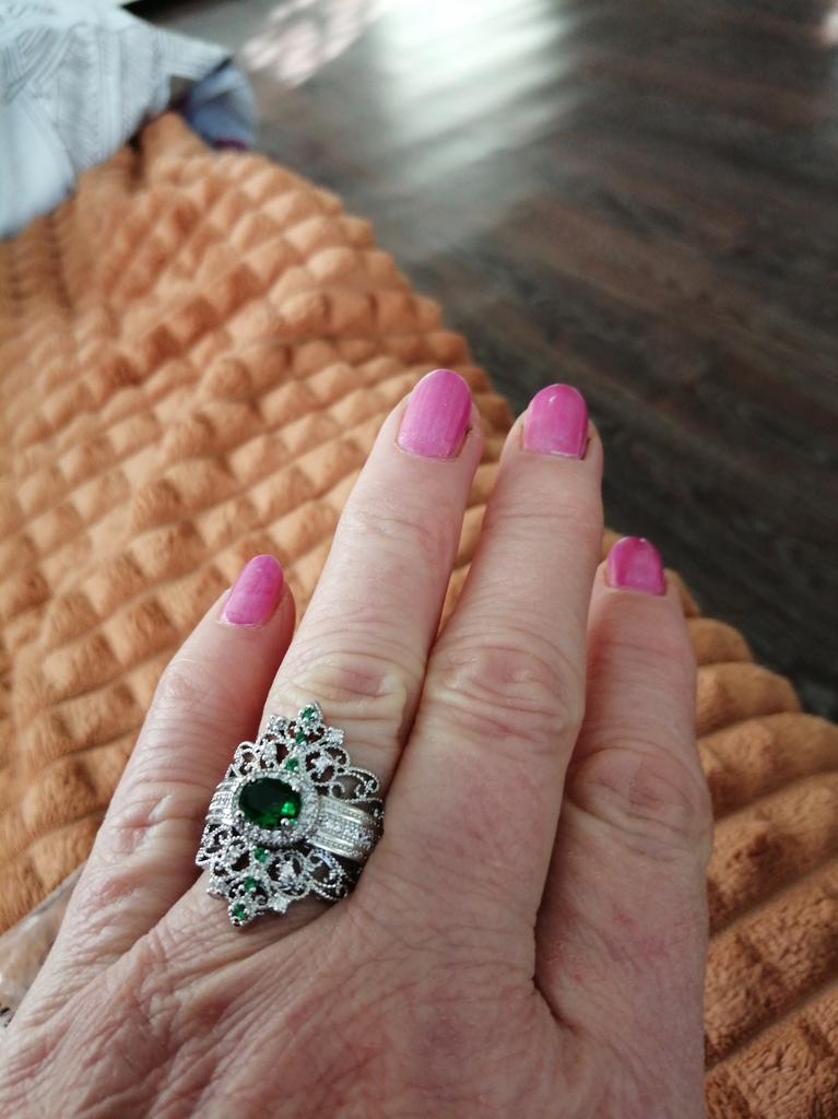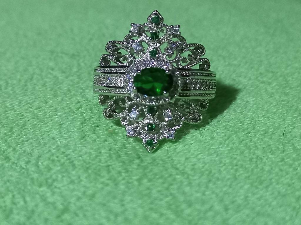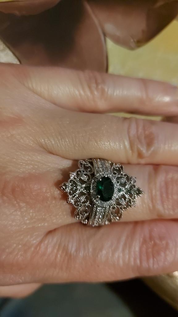 A massive ring in the form of a crown, it looks vintage, as if from the casket of a great-grandmother - a duchessπ€. I am satisfied with the quality, the color of the stone is deep green, emerald. I ordered size 7, it fit. Attracts attention, sparkles beautifully due to tiny rhinestones. It looks really royal. However, due to its pomp, you can wear it with something classic, evening.