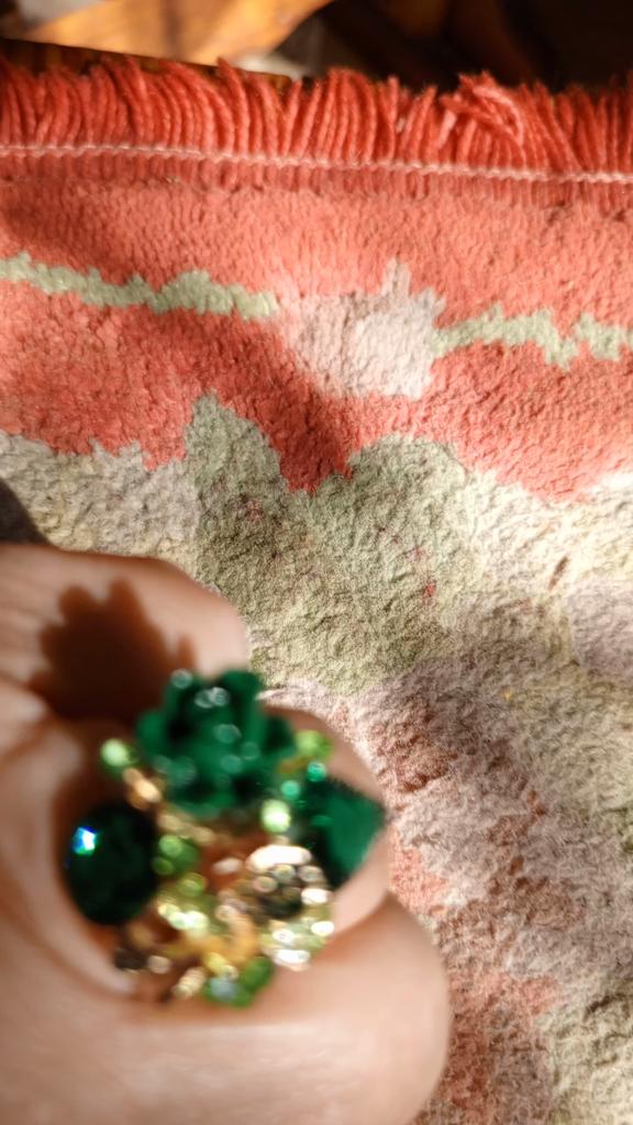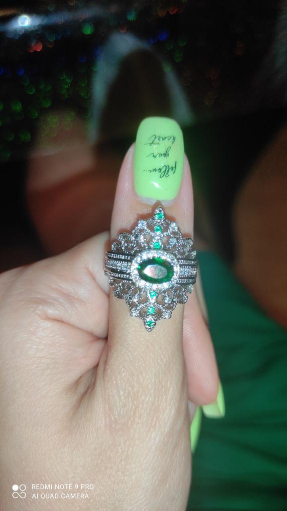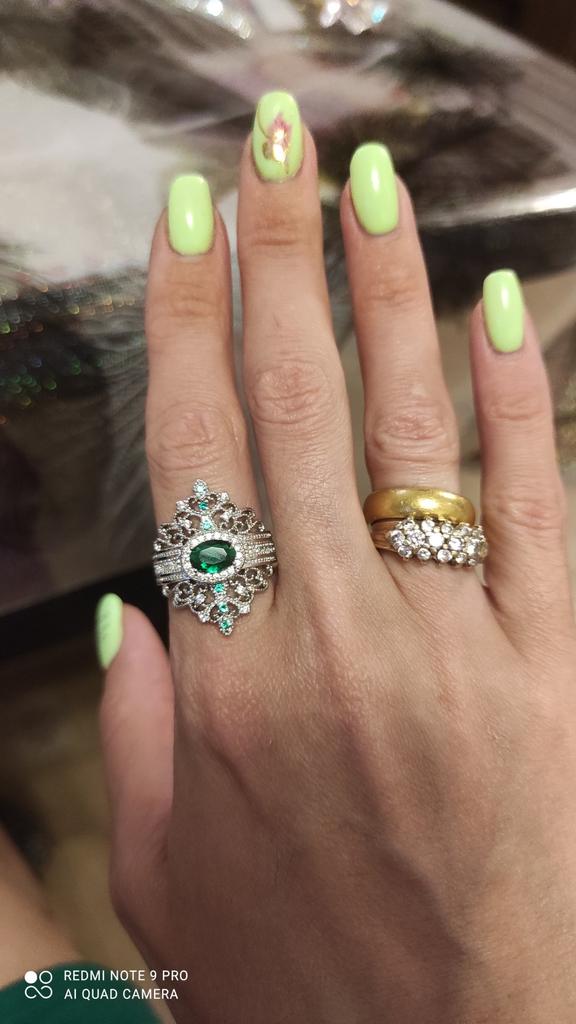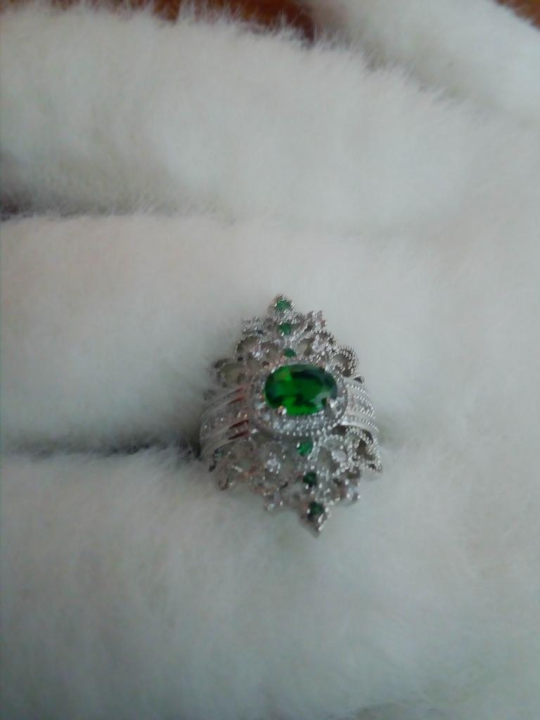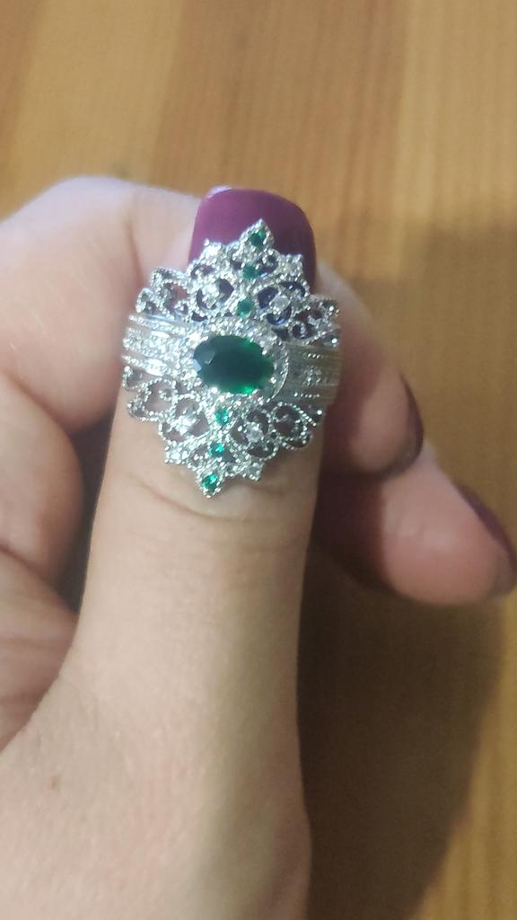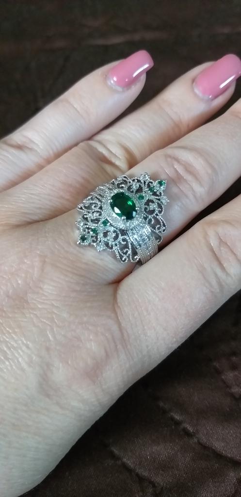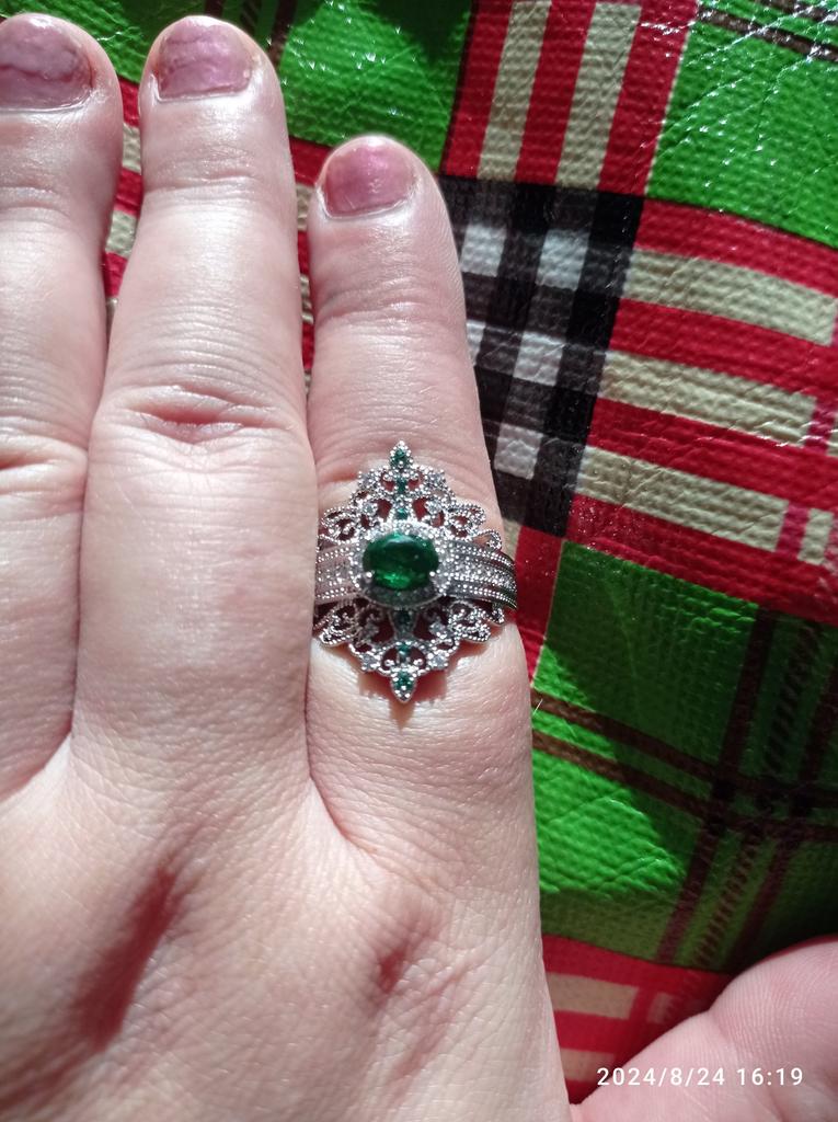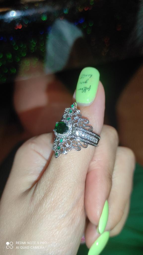 A massive ring in the form of a crown, it looks vintage, as if from the casket of a great-grandmother - a duchessπ€. I am satisfied with the quality, the color of the stone is deep green, emerald. I ordered size 7, it fit. Attracts attention, sparkles beautifully due to tiny rhinestones. It looks really royal. However, due to its pomp, you can wear it with something classic, evening.