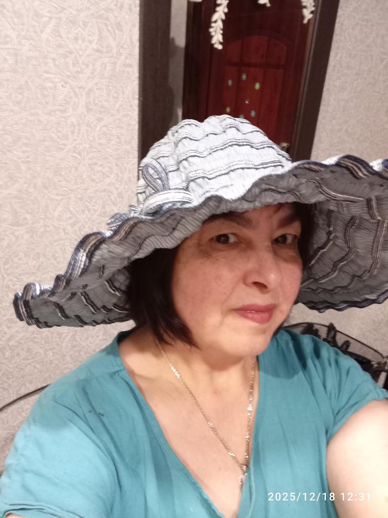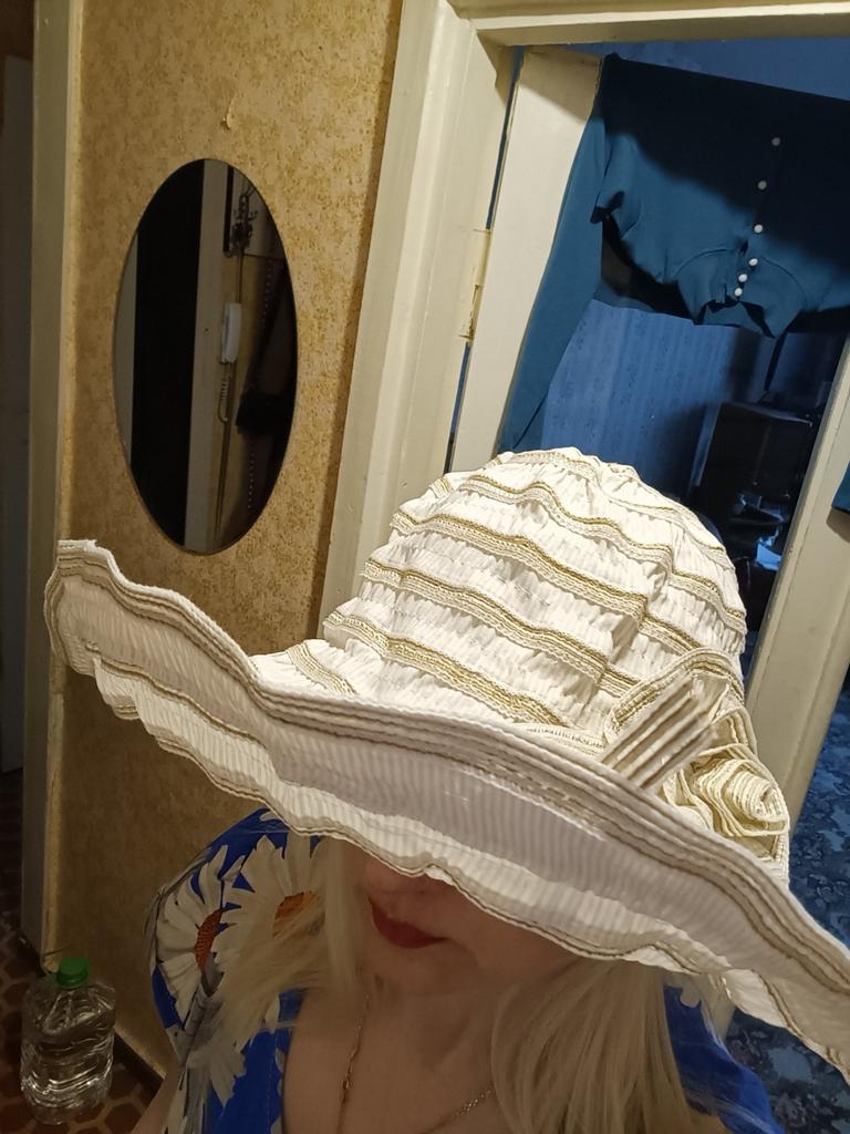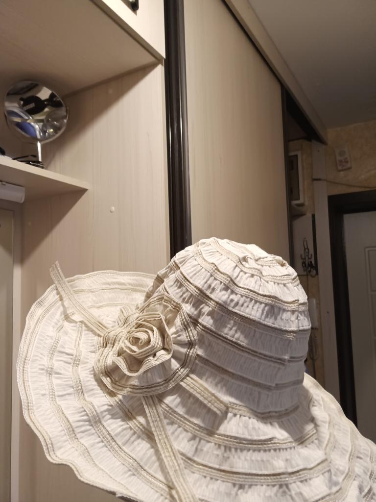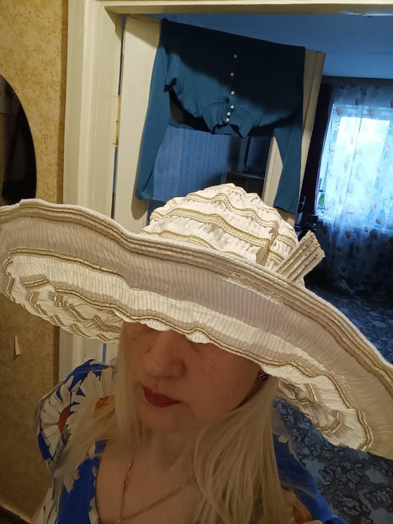 The hat is beautiful, it fits well, there are narrow ribbons inside for any size, very comfortable.