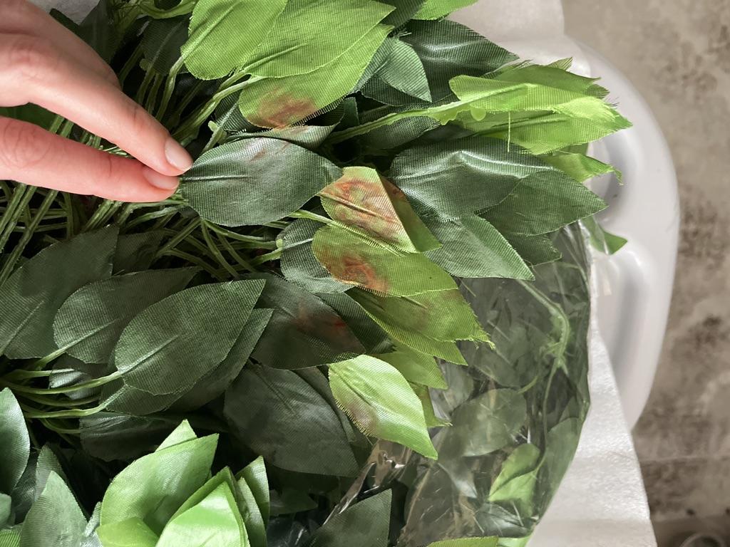 The leaves are stained with something brown. I tried to wash it, but it won’t come off!!! Isn’t it a shame to send this to a buyer???