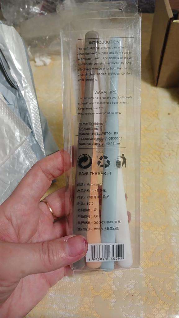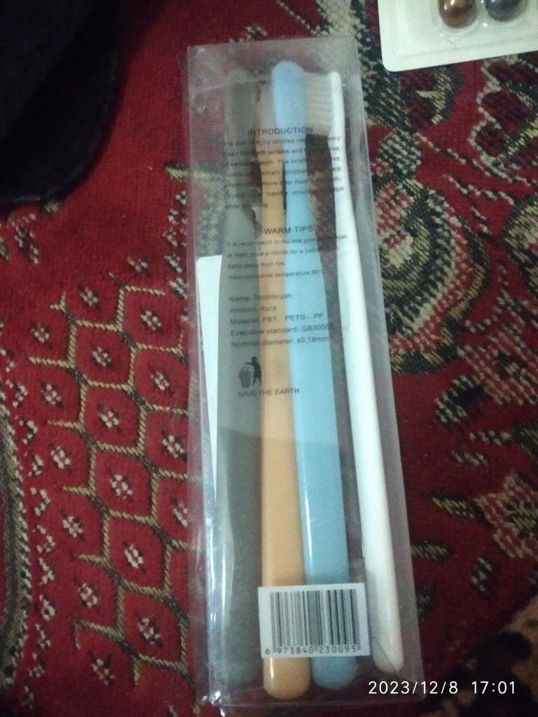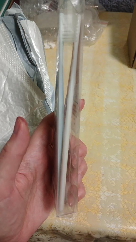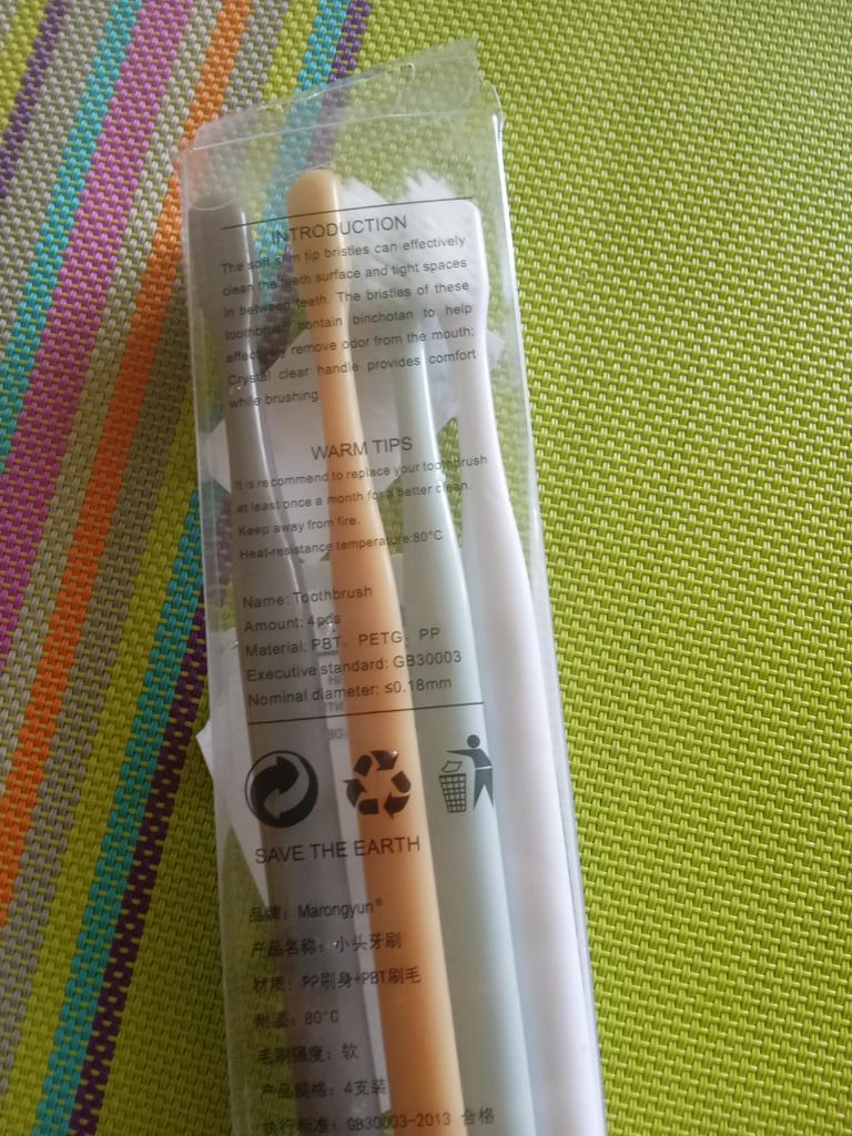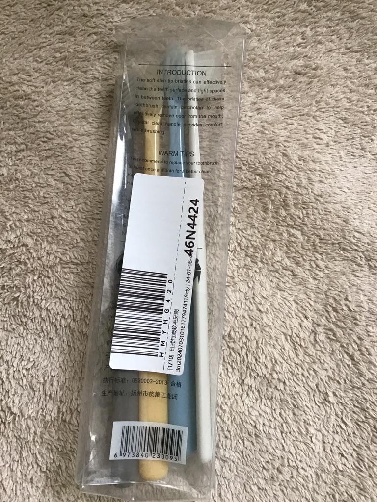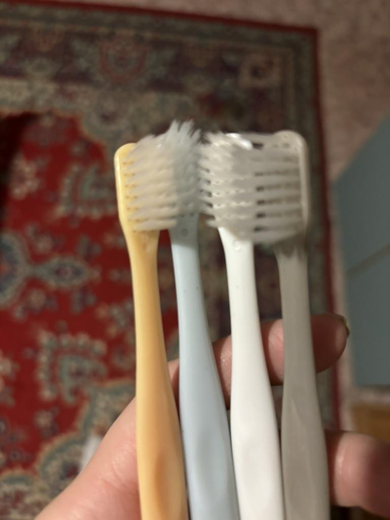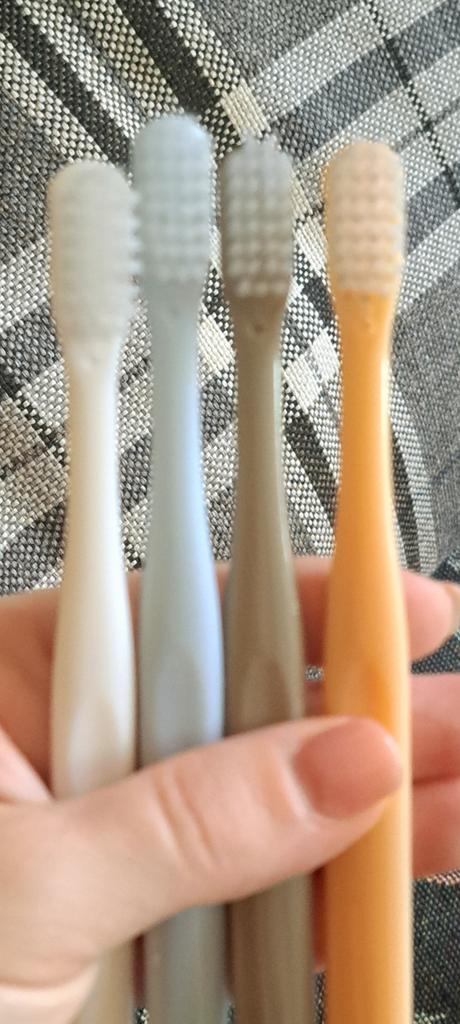 Brushes for delicate gums I really liked the design of these toothbrushes. Everything is very beautiful and concise. That's why this is the second purchaseπ The brushes did not smell anything. No bristles, no handles. There were no burrs. Only black isolated specks on the plastic. The box is transparent, poorly closed or crushed on the way The bristles are soft, elastic. Cleans teeth well. The brushes are small, the first time it is not used to clean, but I quickly got used to it. They are perfect for owners of sensitive gums or children. And they will fit perfectly into the design of the bathroom π
