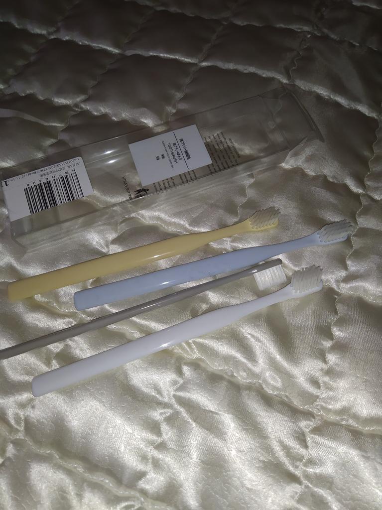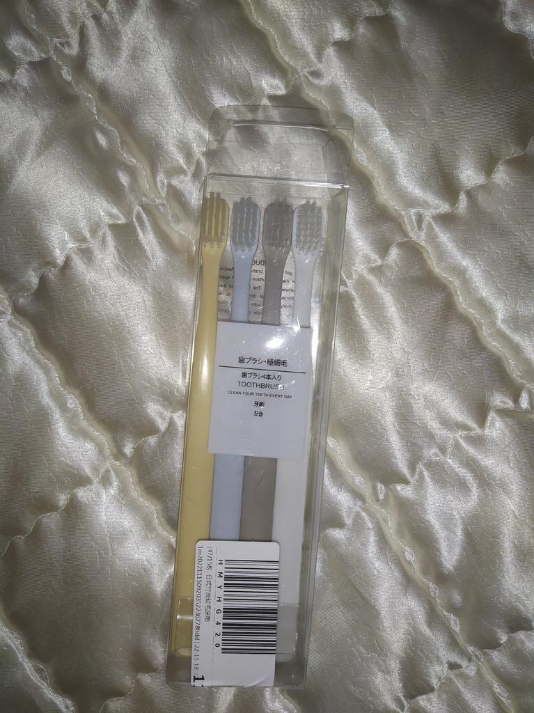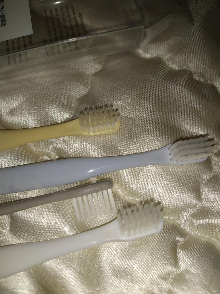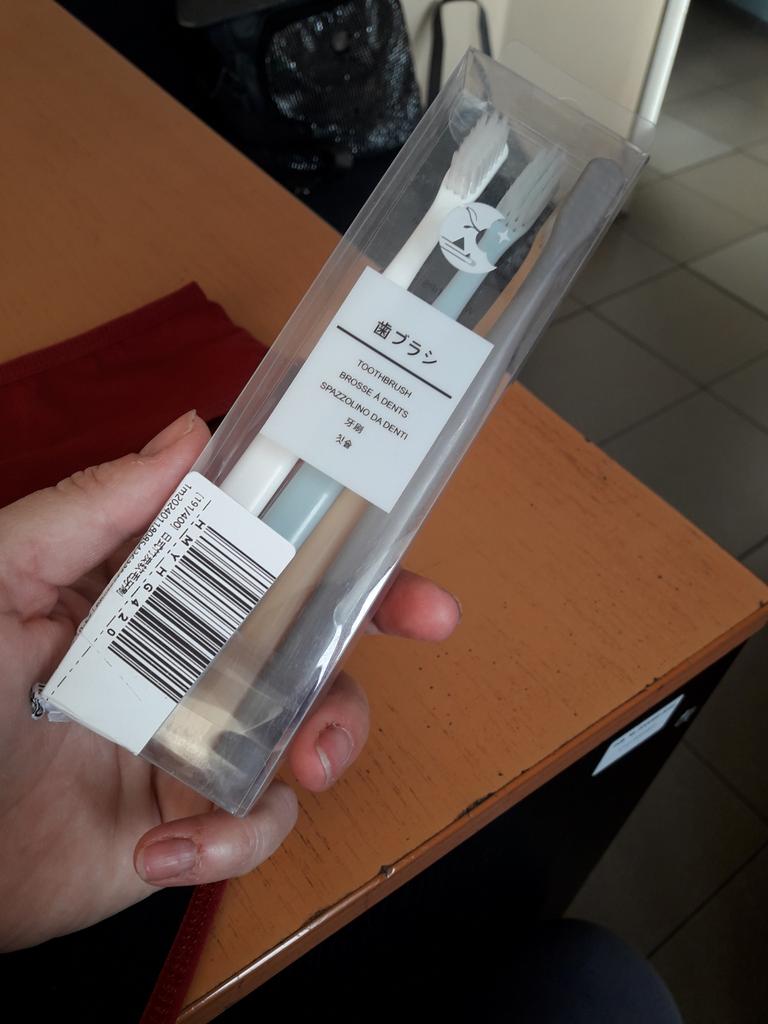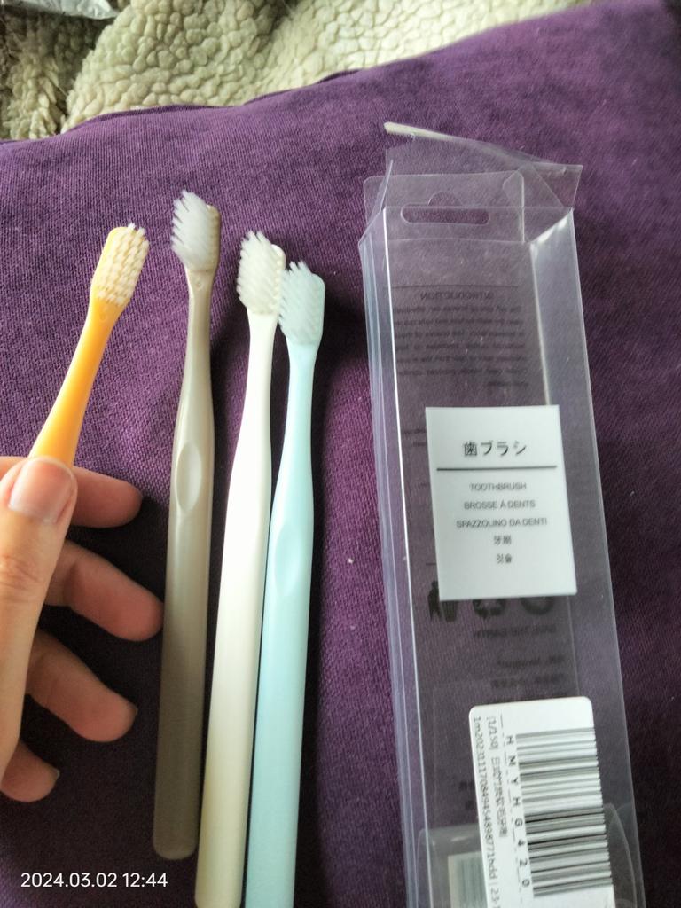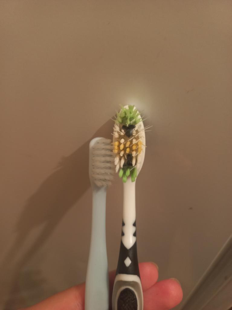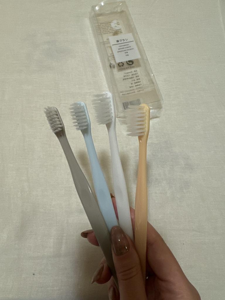 Brushes for delicate gums I really liked the design of these toothbrushes. Everything is very beautiful and concise. That's why this is the second purchaseπ The brushes did not smell anything. No bristles, no handles. There were no burrs. Only black isolated specks on the plastic. The box is transparent, poorly closed or crushed on the way The bristles are soft, elastic. Cleans teeth well. The brushes are small, the first time it is not used to clean, but I quickly got used to it. They are perfect for owners of sensitive gums or children. And they will fit perfectly into the design of the bathroom π