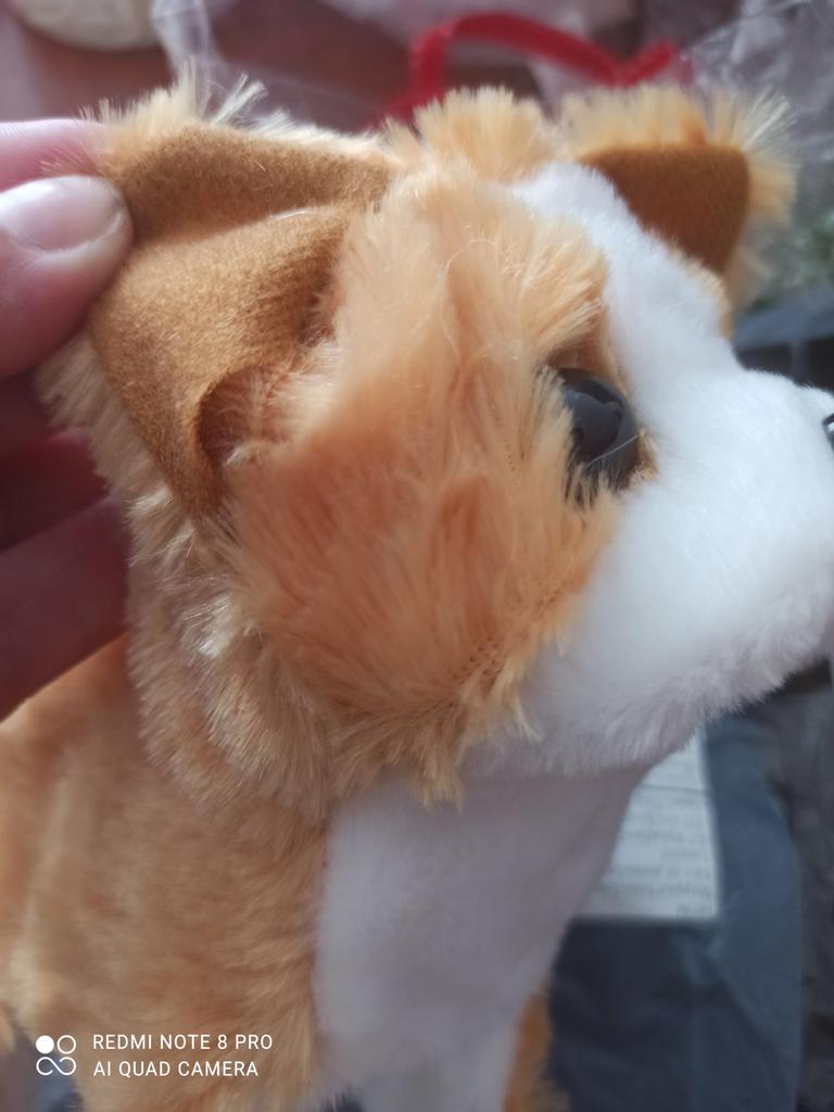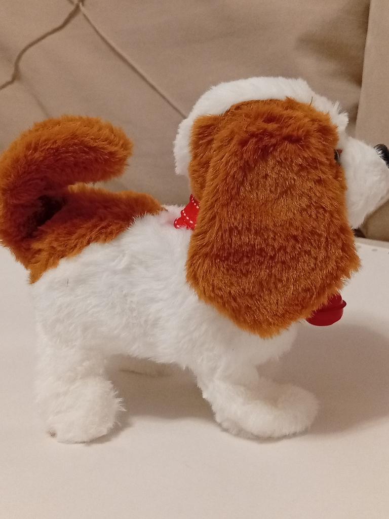 Nice dog. Good quality. The material is pleasant, like an artificial rabbit. Barks and stomps