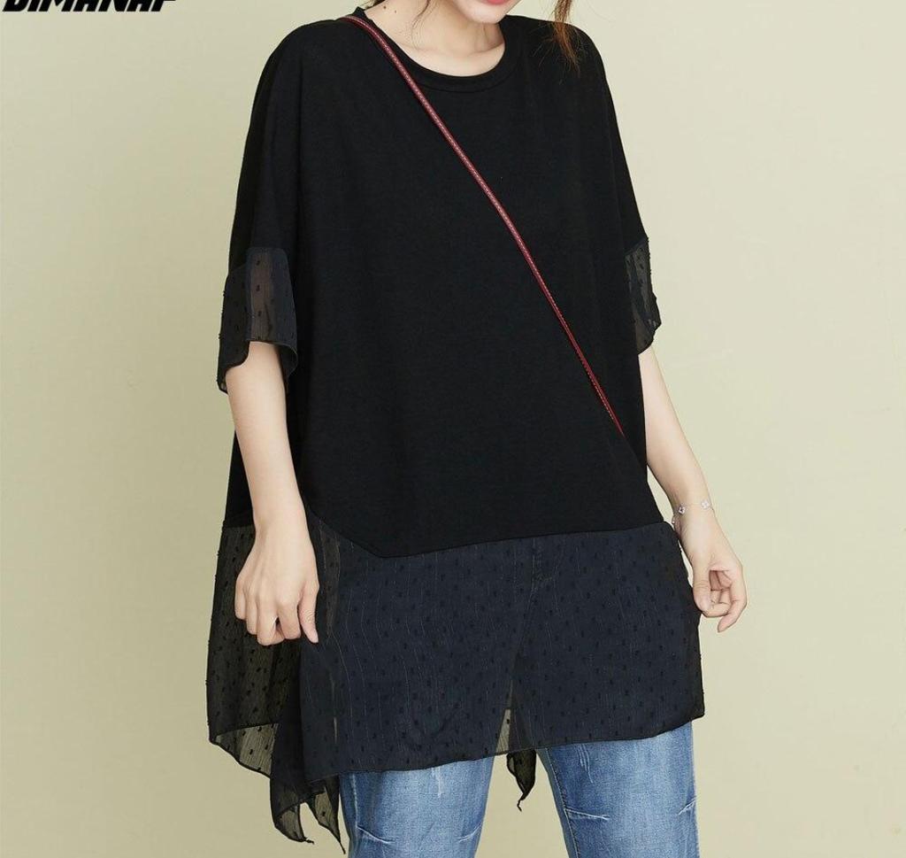 DIMANAF 2021 Plus Size Women T-Shirt Fashion Female Summer Patchwork Oversize Lace O-Neck Cotton Loose Short Sleeve Tops&Tees