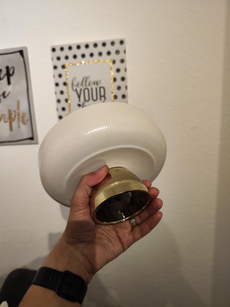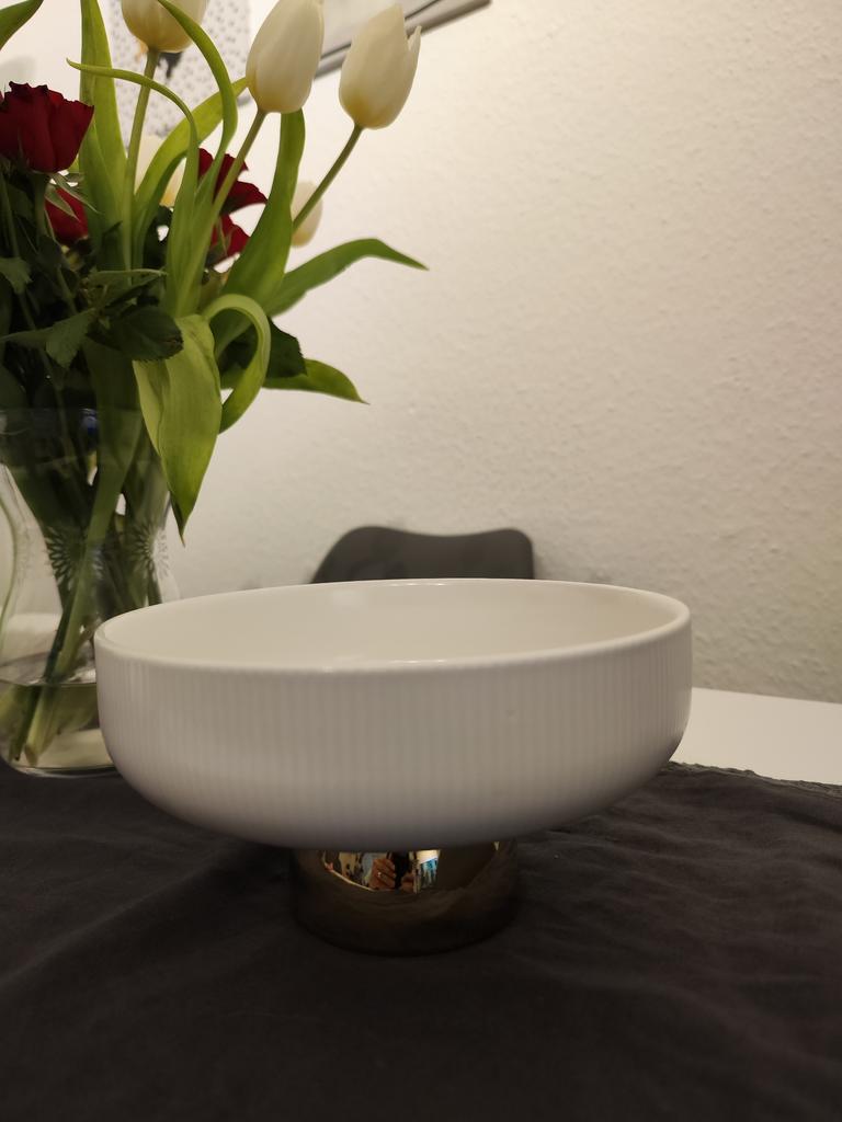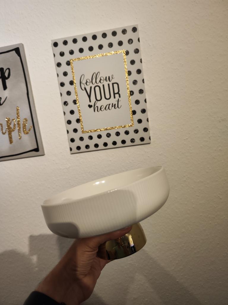 I ordered the fruit plate with stand directly in 2 sizes. The material is ceramic and has a good quality. The delivery was very quick and securely packaged. You can use the plate either for fruit or for snacks. Dimensions: 15.4cm x 7.8cm Maße: 20,4 cm x 10,5 cm Delivery time: about 3 weeks Material: Ceramic Colour: white/gold Dishwasher safe