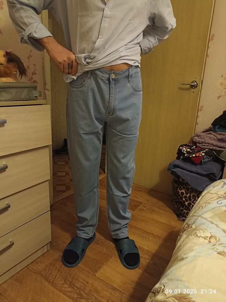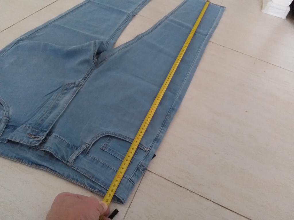 The jeans are at least a size too small and two centimeters too short compared to the size chart. The fabric is of good quality, the sewing is neat, the button and zipper look to be of good quality.