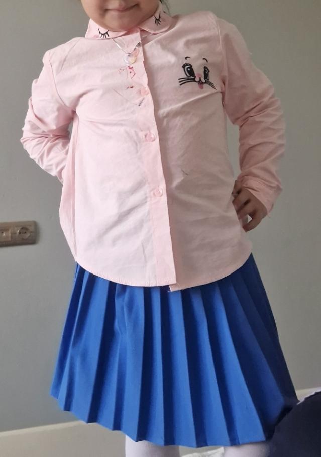 The shirt is lovely. Cotton is just right for us at school. It's a pity there is no blue color.