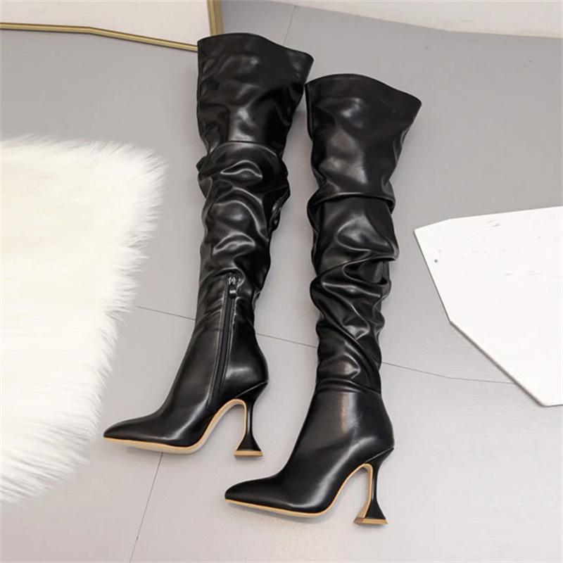 Eilyken Design Pleated Leather Over The Knee Boots Fashion Runway Strange High Heels Sexy Pointed Toe Zip Womans Shoes