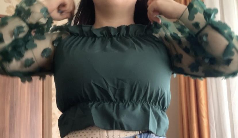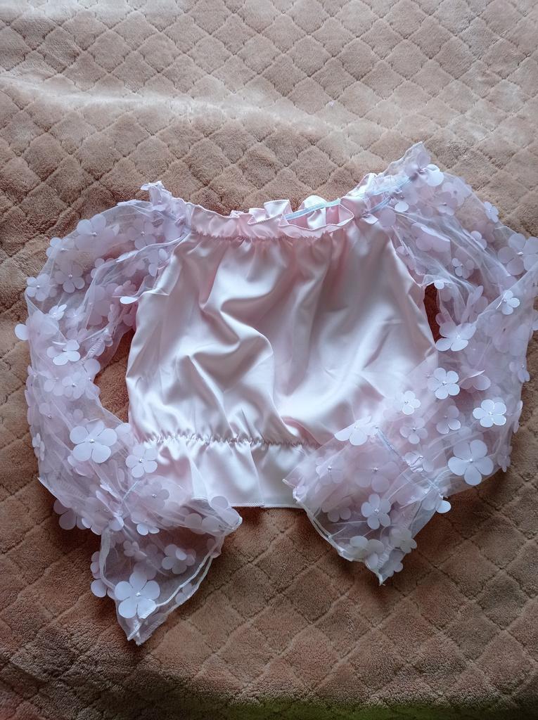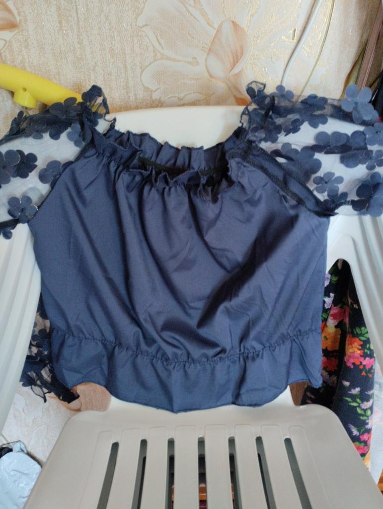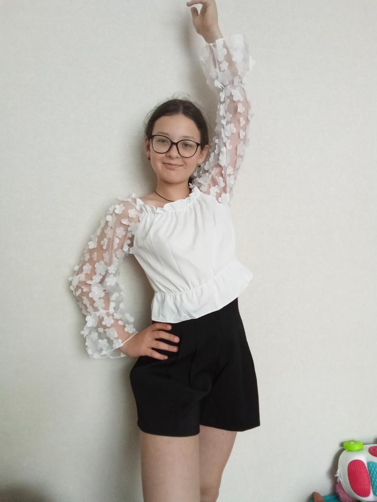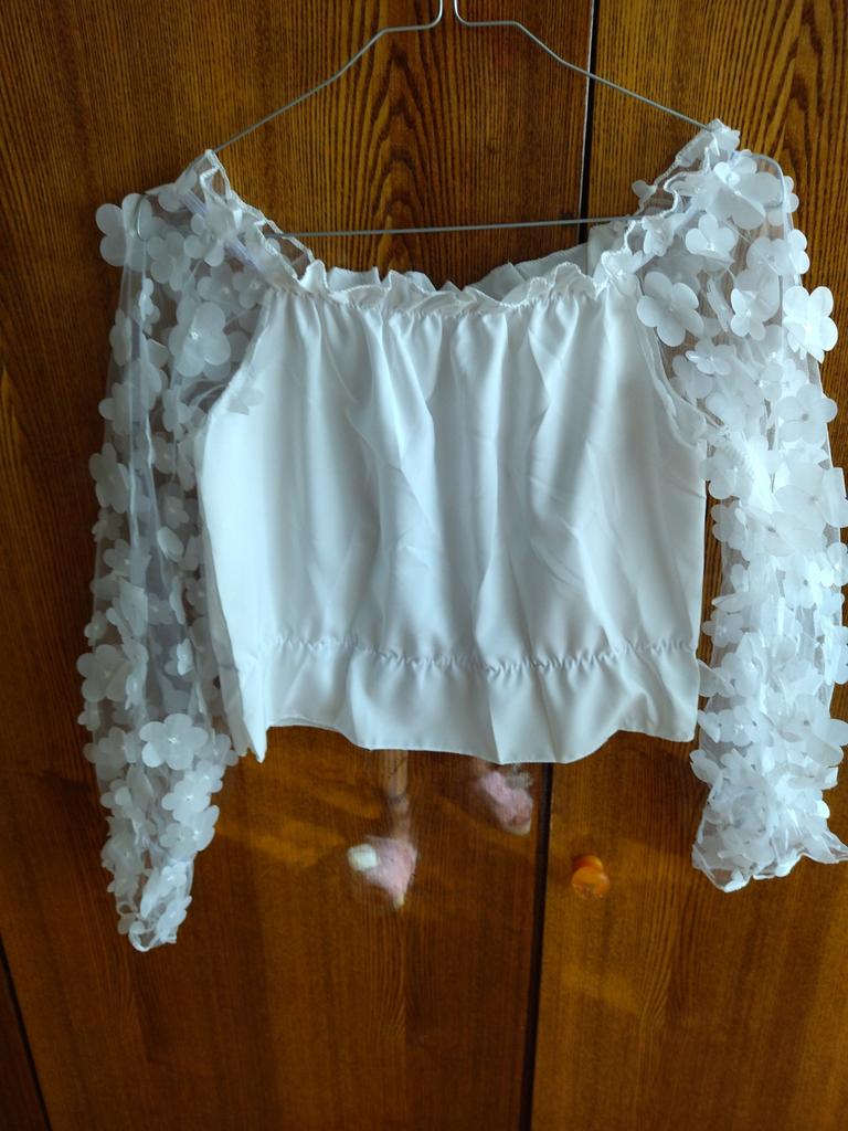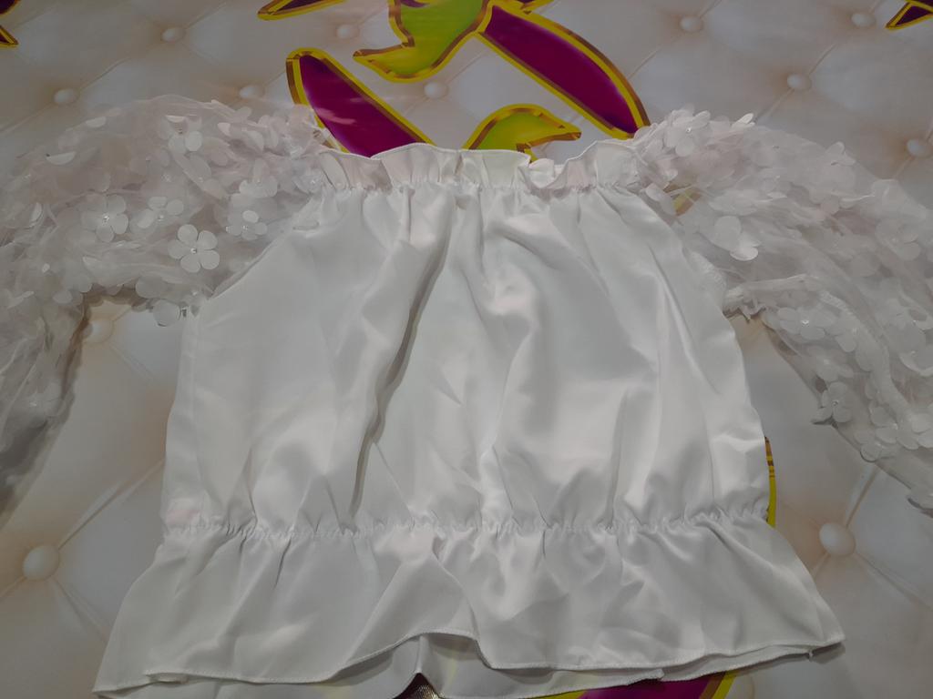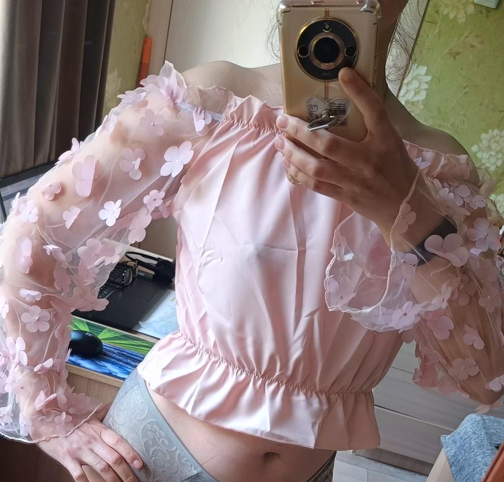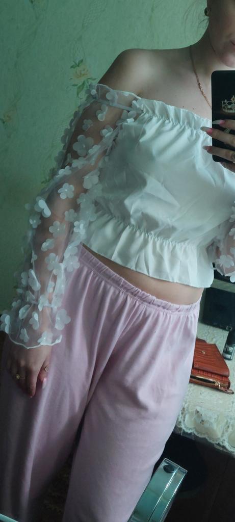 Cuteness. It looks very gentle and elegant. Tulle sleeves with sewn flowers. The product itself is made of thin blouse fabric containing cotton, not the cheapest. The top and bottom are elastic, everything is overlogged. I recommend.