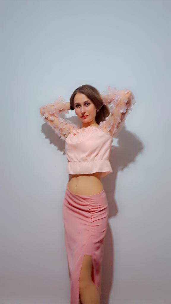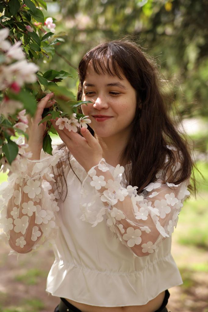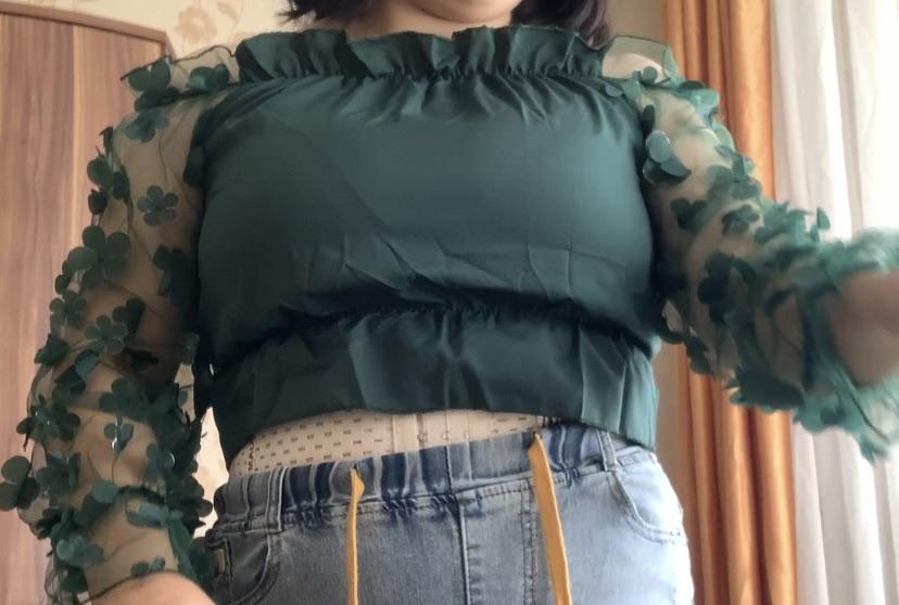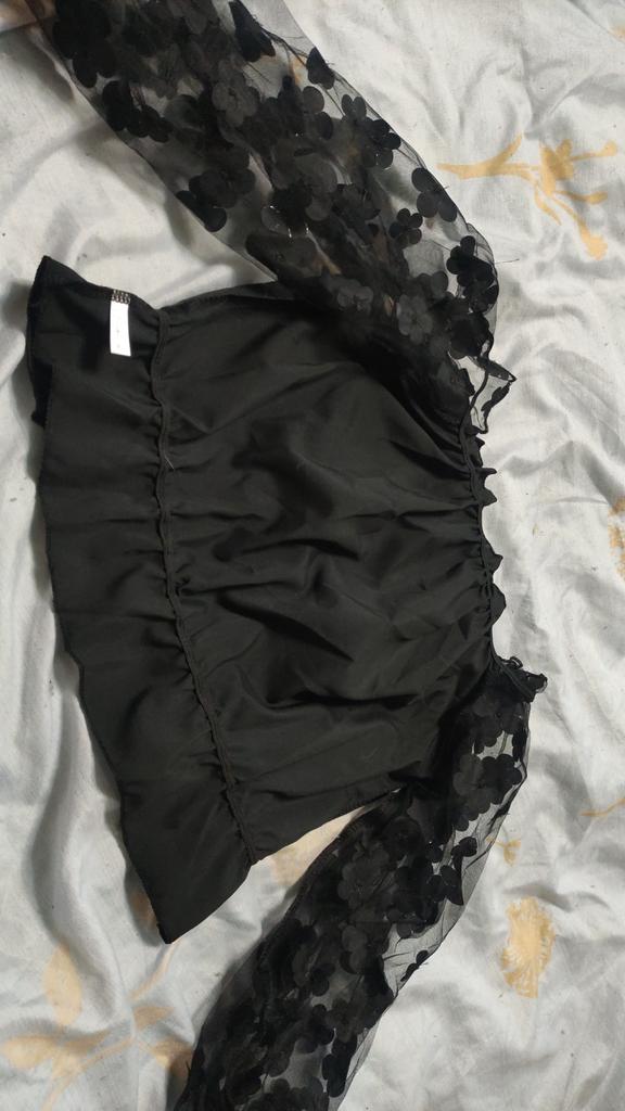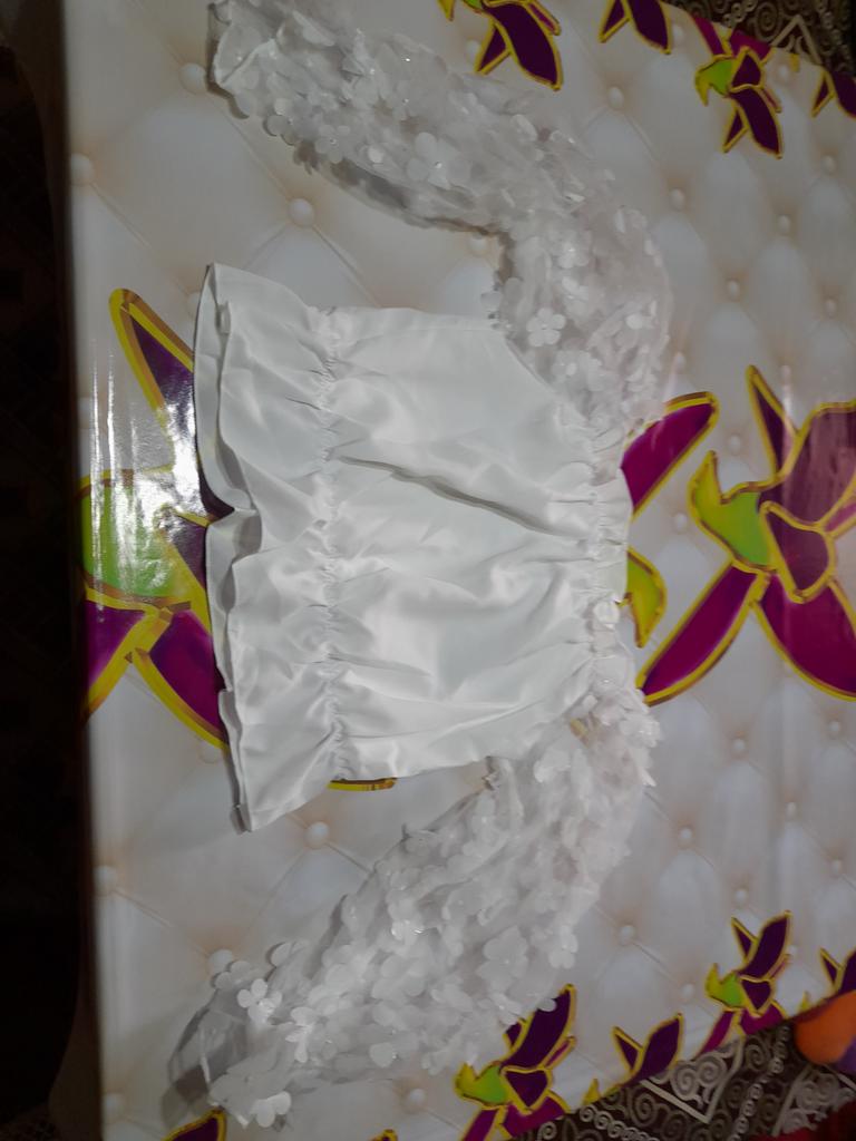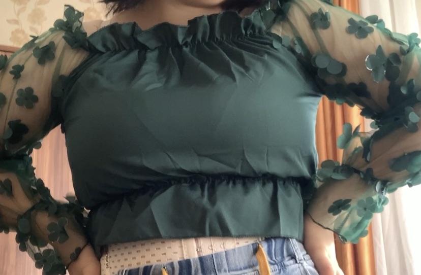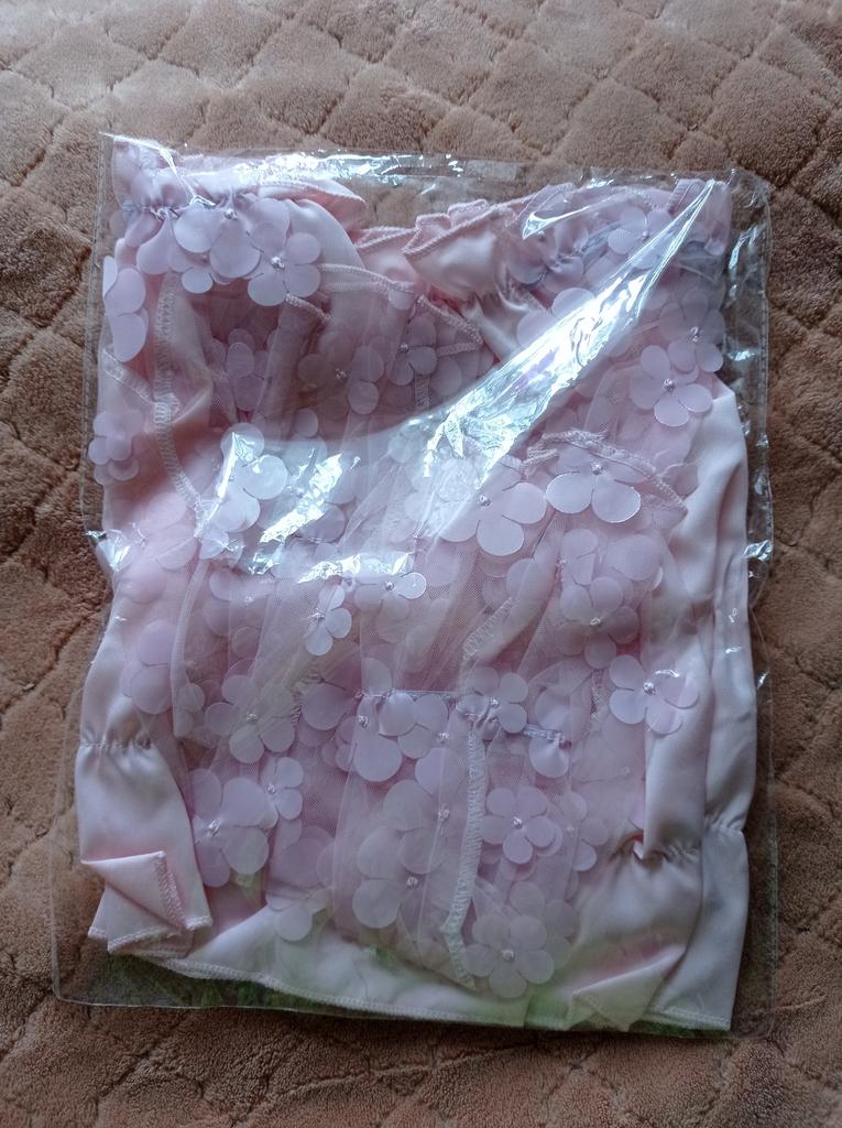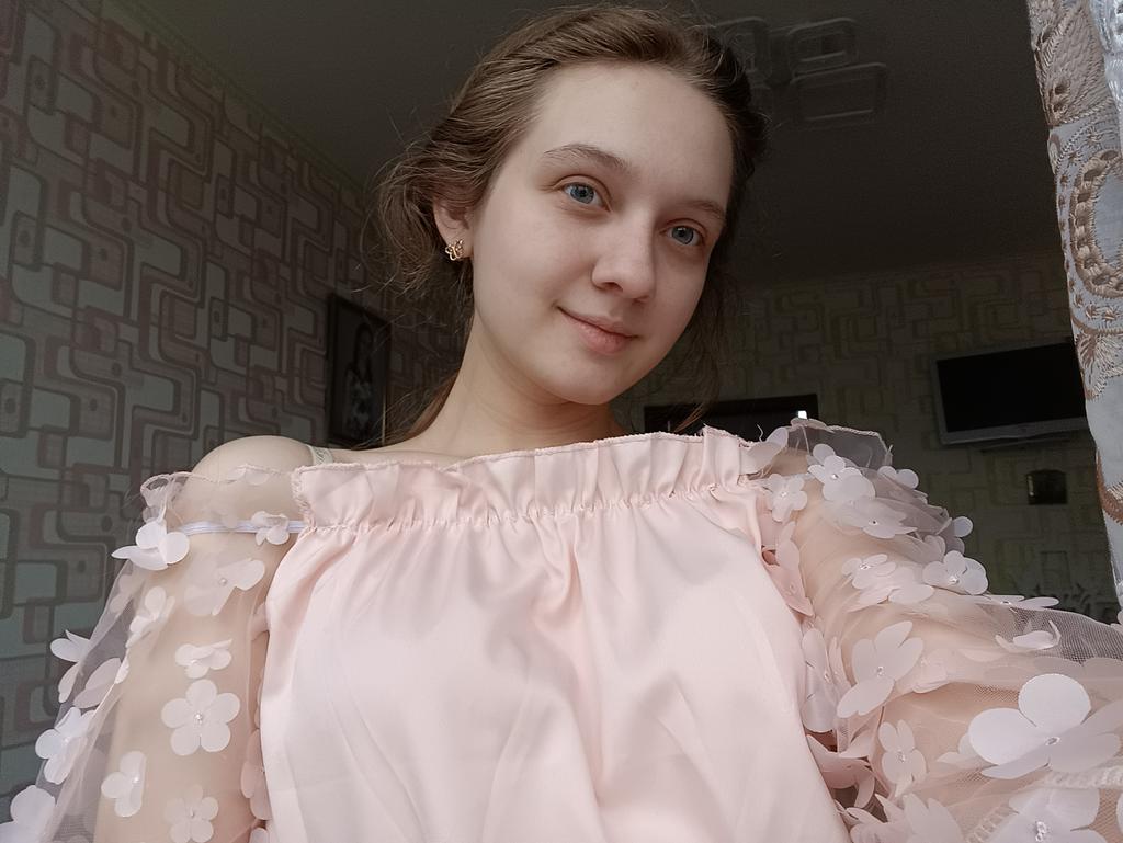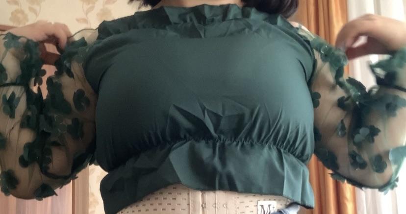Cuteness. It looks very gentle and elegant. Tulle sleeves with sewn flowers. The product itself is made of thin blouse fabric containing cotton, not the cheapest. The top and bottom are elastic, everything is overlogged. I recommend.