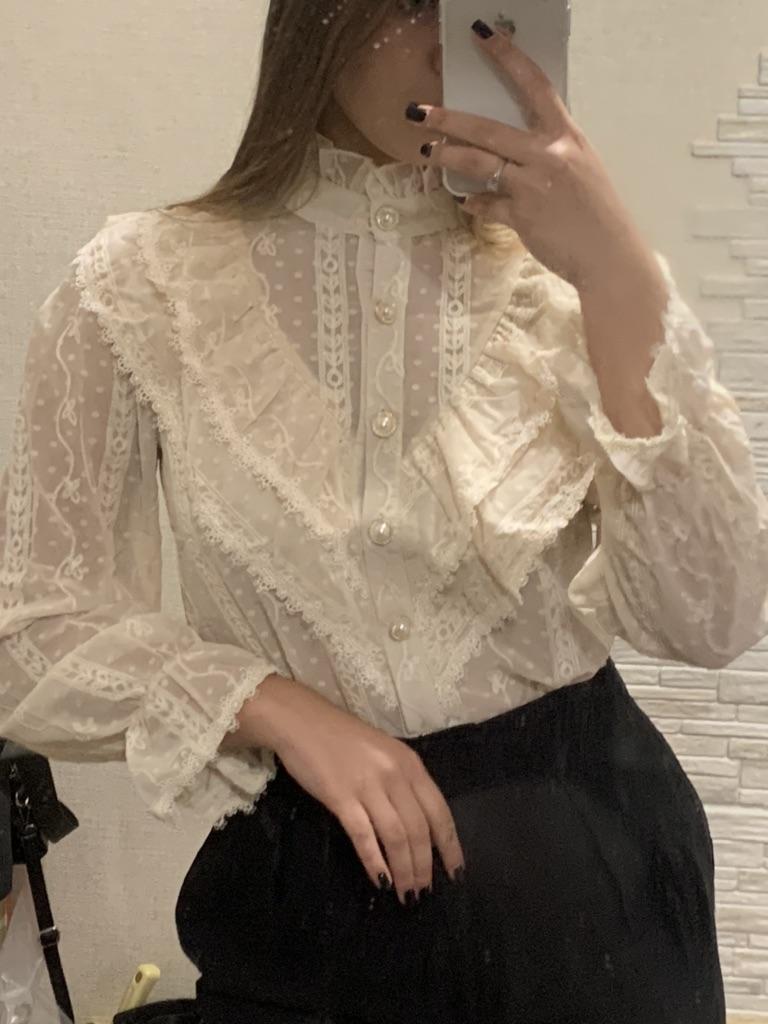 Fashion Ruffle Vintage Blouse Women Elegant Long Sleeve Lace Shirt Loose Chiffon Shirts Stand Collar Pleated Tops Blusas 15832
