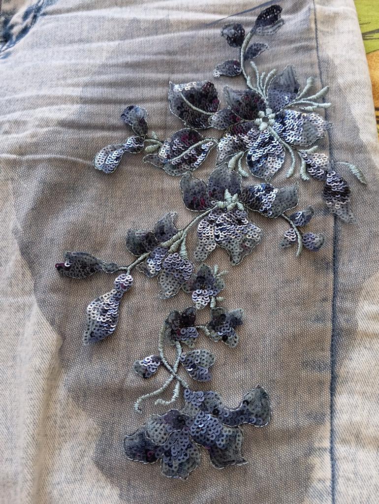 The embroidery is delicate and very beautiful. The flowers are embroidered with two types of 3mm sequins: matte and shiny golden. The stems and outlines of the petals are embroidered with gold lurex. The embroidery is done on a mesh, easy to sew on to any product. Beauty!