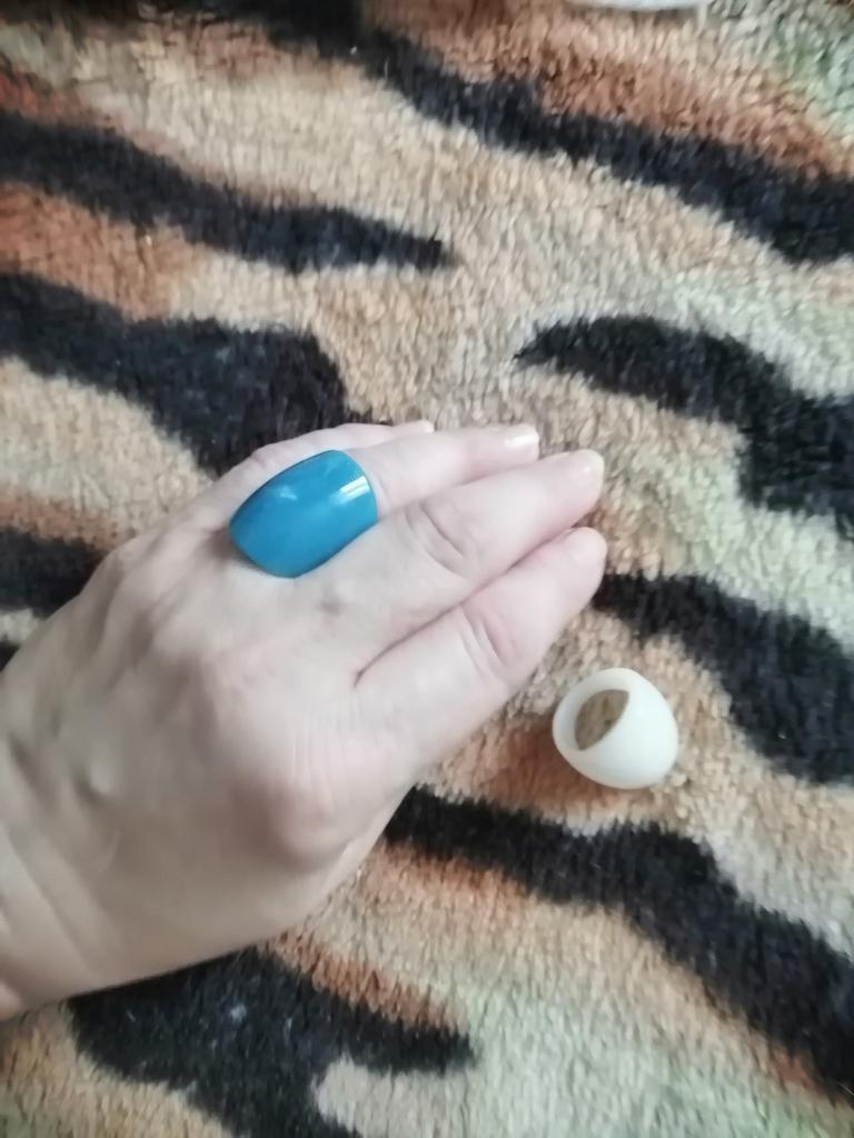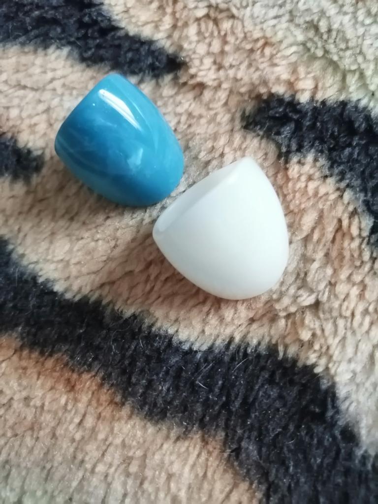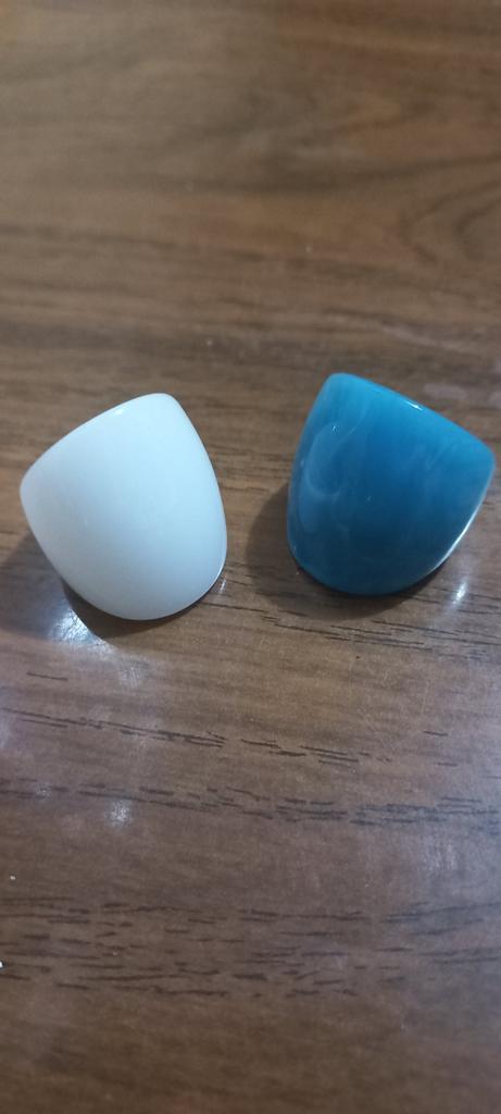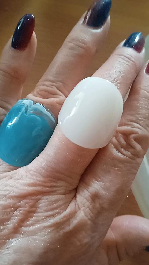 Cute little plastic rings. The white one is quite simple, but the blue one can be worn for variety.
