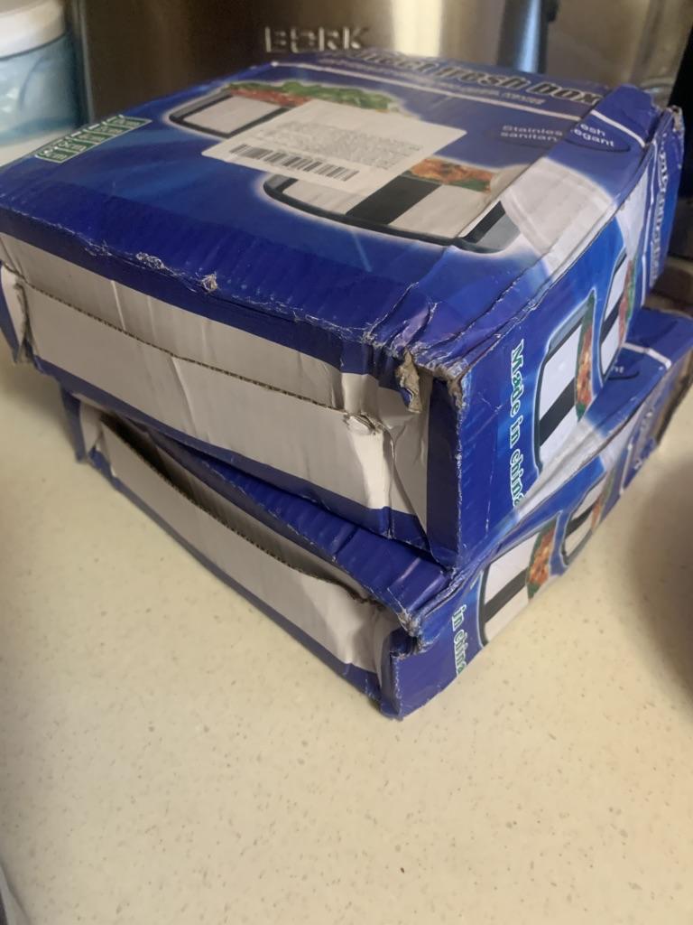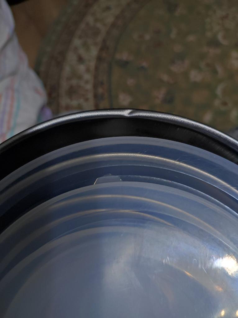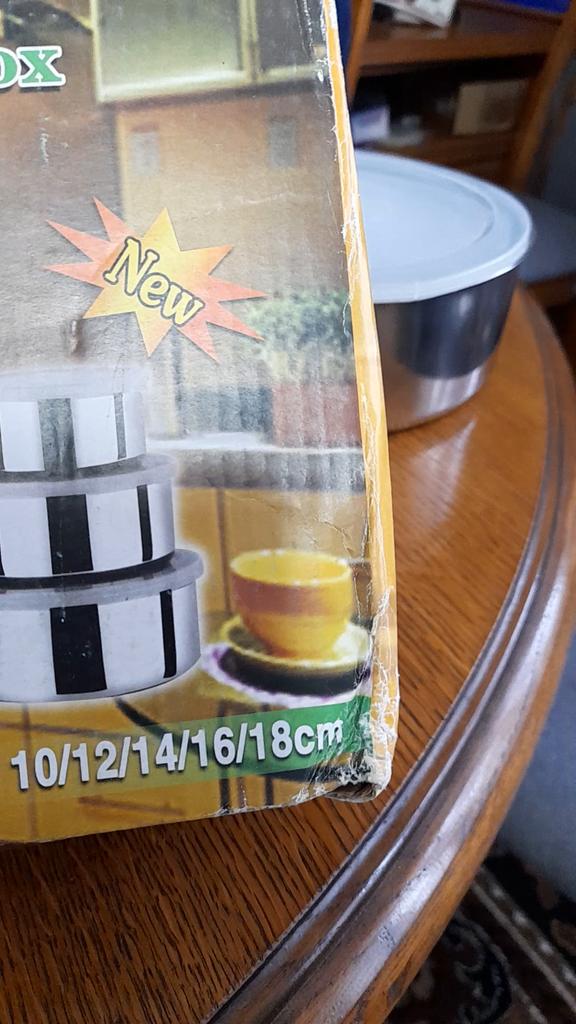 The set arrived with a dent, unpleasant. I like these containers, I've been using them for years. I bought them in the store, cheaper.