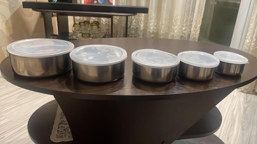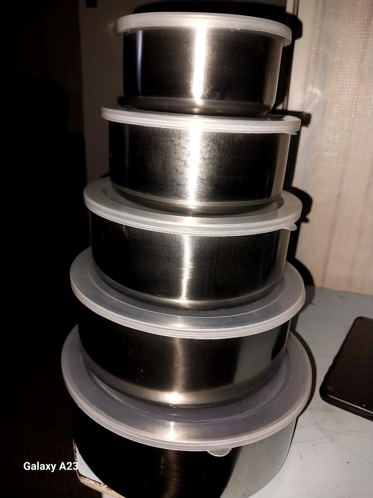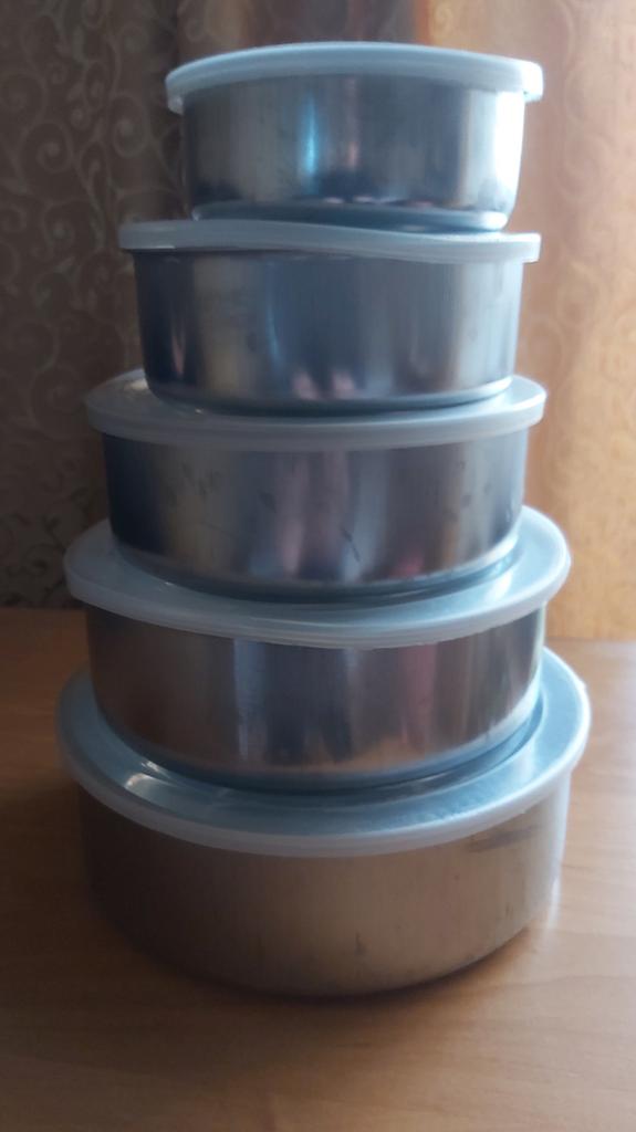 5 metal tupperware with plastic lid. They are great for freezing and for food that is eaten cold, because being metal they cannot be put in the microwave. I use them to eat at work and they are phenomenal. They have 5 different sizes