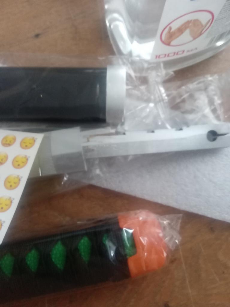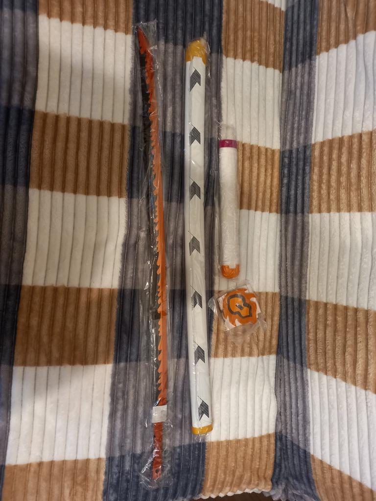 materials: - handle: rope and plastic. - blade: wood. -case: good plastic. -other "metal" parts: plastic. There is also a silicone oval for fastening the handle. Katana comes unassembled: -hand. -blade. - katana handle stop (sorry, I don’t know how to do it right). - a red piece of plastic to connect the handle and blade. -silver after plastic. - silicone oval. - assembly instructions. The katana is light, pleasant to the touch, the materials are good.