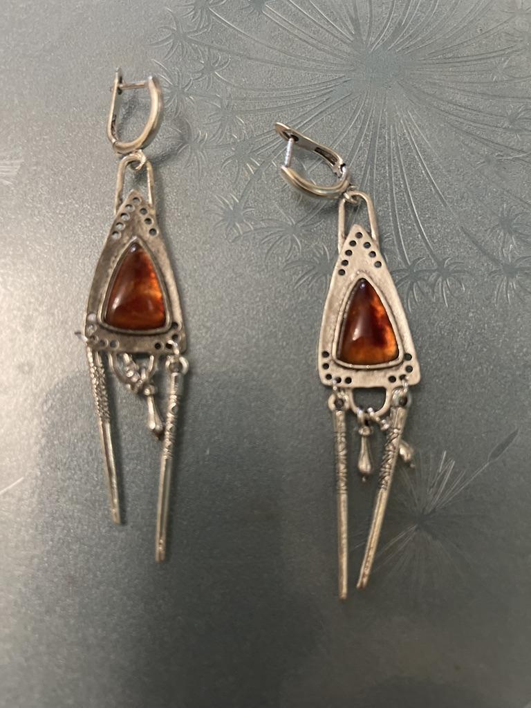 Tribal Triangle Amber Earrings Geometric Jewelry Ancient Silver Metal Tassels Handmade Earrings Europe and America