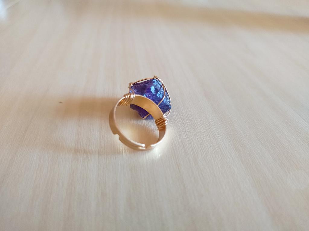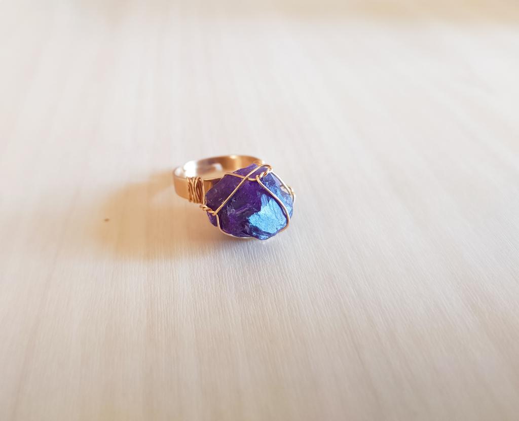Adjustable ring, natural amethyst, rich color. Metal coating is closer to rose gold. Quite nice.