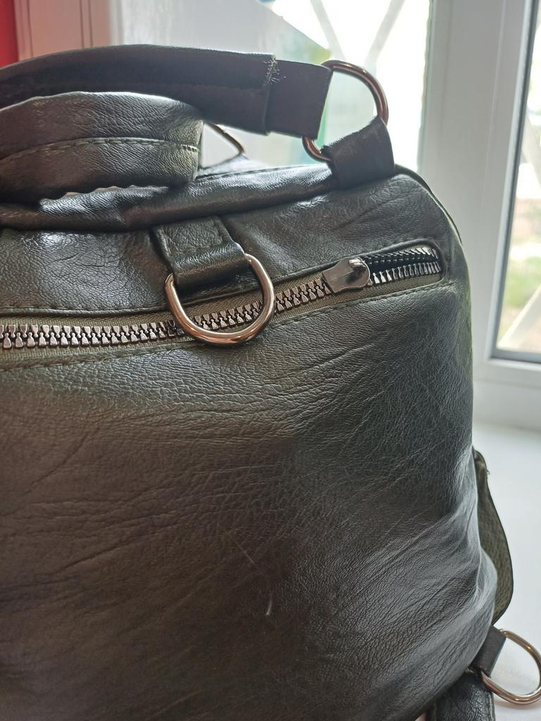 A neat compact bag - backpack. No smell. The color is pleasant, as in the photo: dark gray-green. The leather is soft with a glossy shine. Lots of pockets. I recommend! Thank you!
