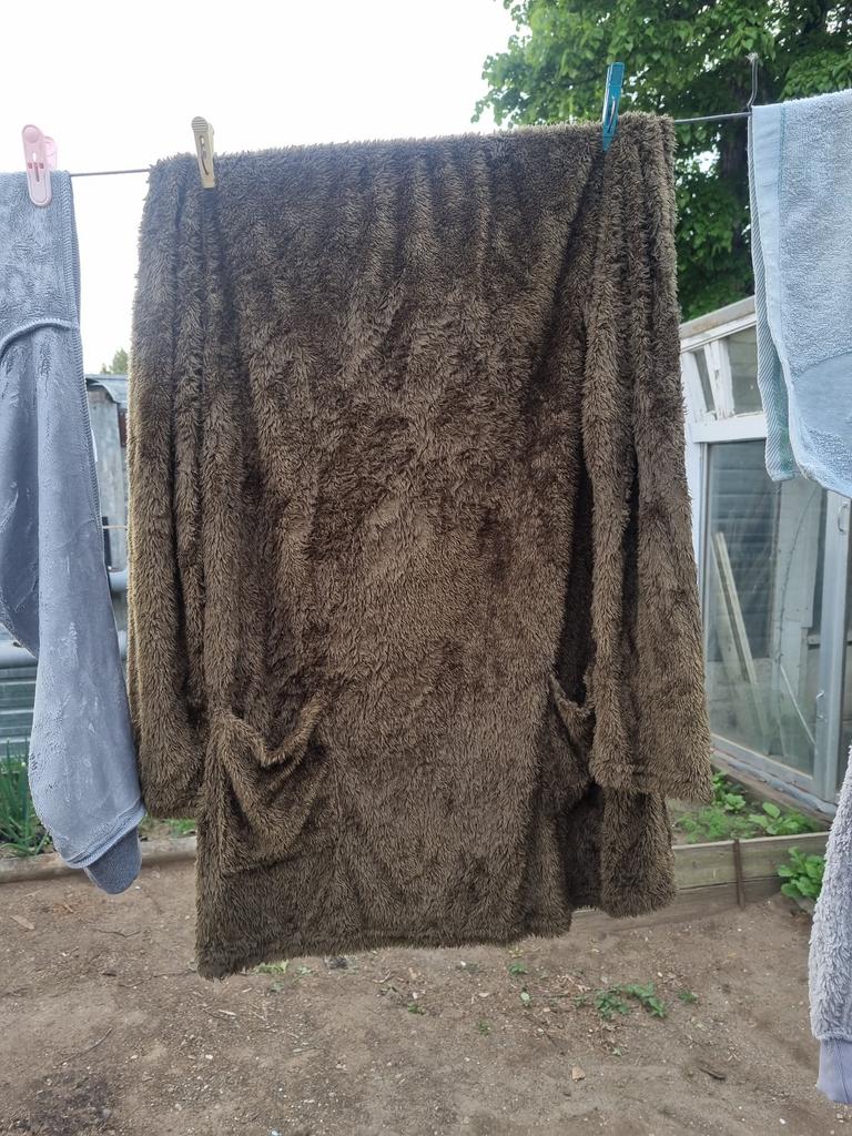 I washed it right away. I really like the material. So warm, soft and light. On the cold mornings of May.