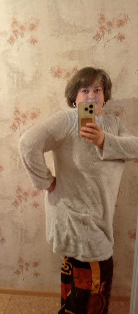 Very loose for size 52-54. The side seams pucker. The fabric was probably stretched during sewing. But the tunic itself is very light and warm. Perfect for wearing around the house.