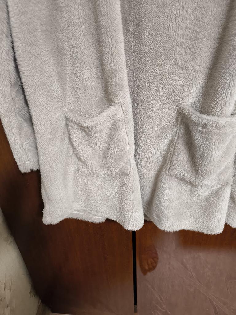 I haven't tried it on yet. Tomorrow I will and I'll tell you. I just tried it on but I don't like the way it looks on me. It's too big and it doesn't keep anything warm and I noticed the detail of the neck is so pretty that it can be seen in the photo. It has it but I'm going to wear it to be at home