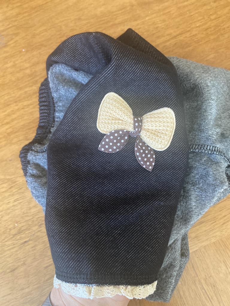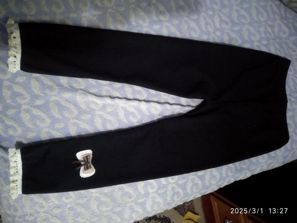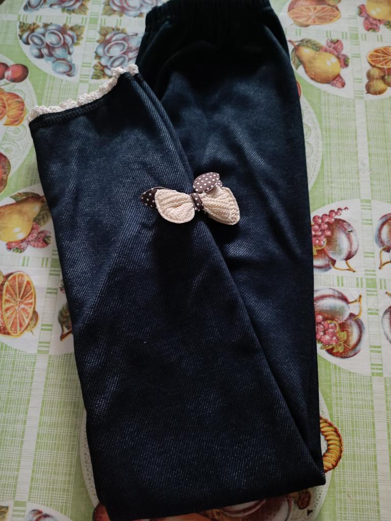 Size 120 for a height of 100 cm, with a thin fleece inside. Beautiful color, cute bows, deep fit.