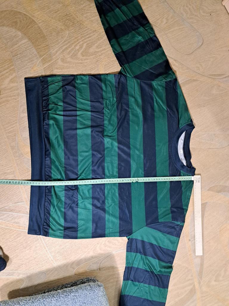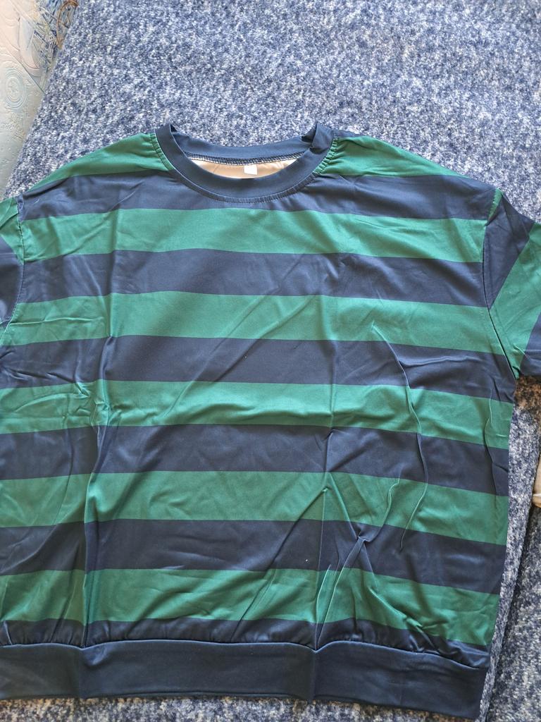 It looks normal, but a slightly larger size was needed as the child wears an oversized fit. The quality is completely synthetic.