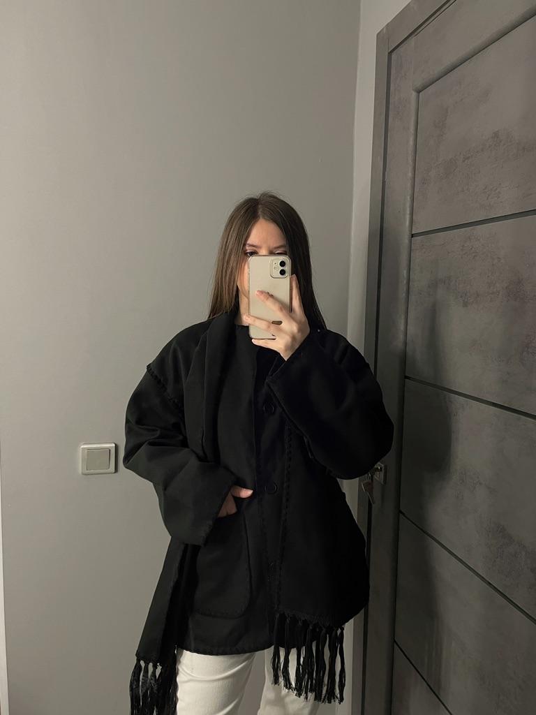 Woolen Jacket Women Autumn Patchwork Tassel Scarf Single Breasted Pocket Coats Casual Fashion Long Sleeve Loose Top Streetwear