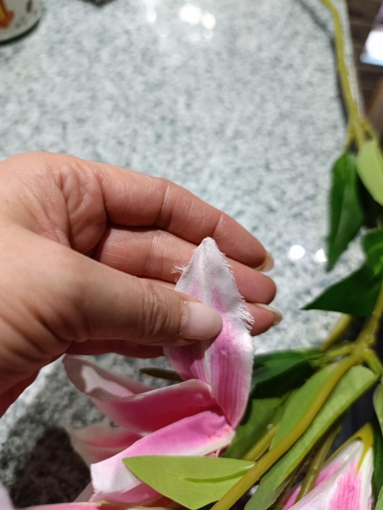 Flowers with a strong smell and threads sticking out of them on the cut of the fabric. Throw away.