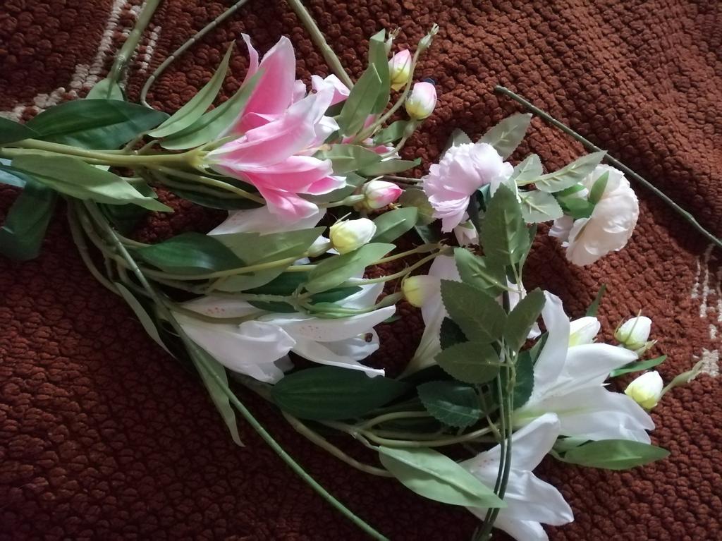 The most beautiful flowers. I steamed them and they look like they're alive. I took two pink ones and a white one. A beautiful bouquet.
