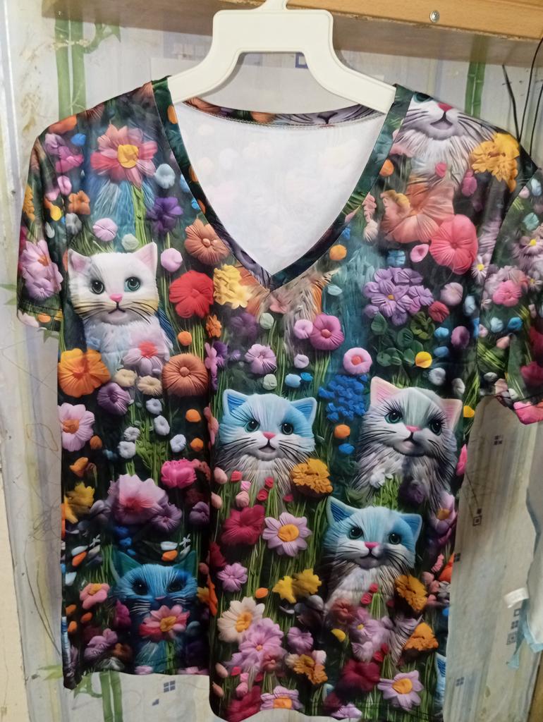 3D Cat Short Sleeve Tee Shirt 2024 New V-Neck Women's T-Shirt Funny Pattern Pullover Top Vintage Fashion T Shirt for Women Tops
