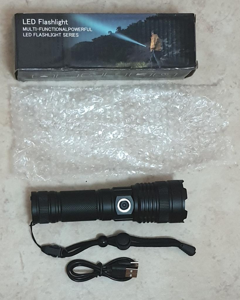 Features: Telescopic zoom; Long press stepless dimming; Mobile power supply function; Lotus attack head design; 2M resistance to drop and pressure