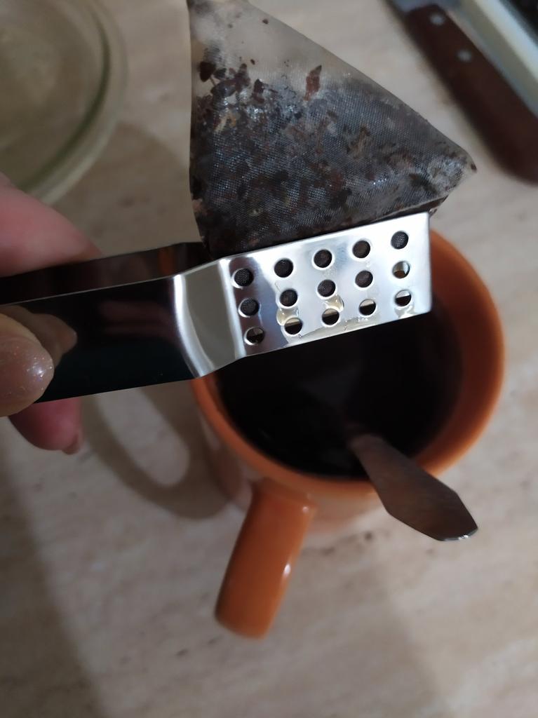 A device for lifting a tea bag from a tea cup and squeezing it.