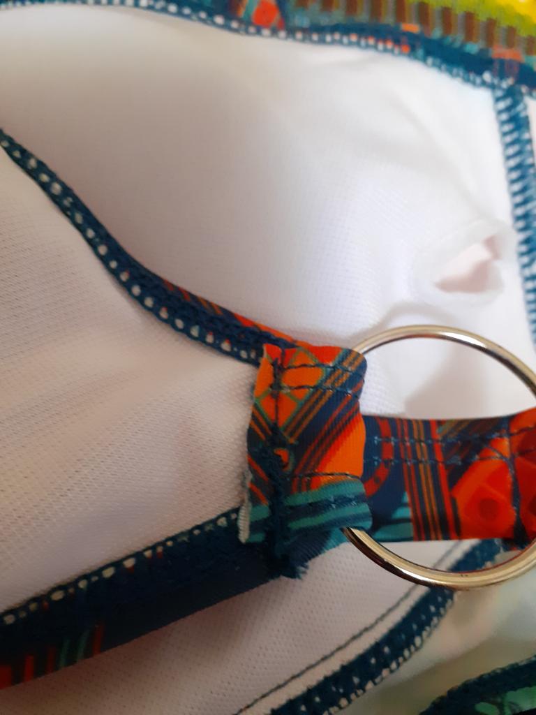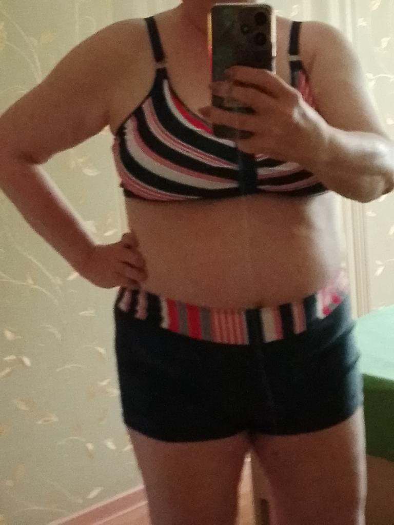 The top of the swimsuit looks very bulky, but a large bust doesn't fit into the small cups. The asymmetrical stripes give an impression of careless sloppiness. Poorly sewn, threads are sticking out