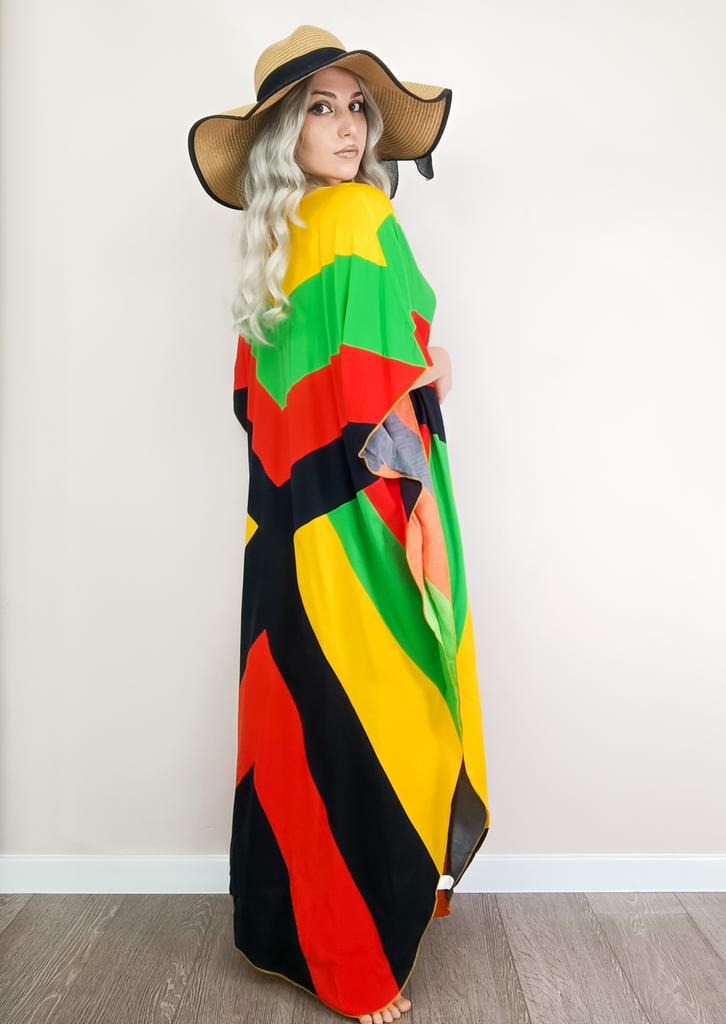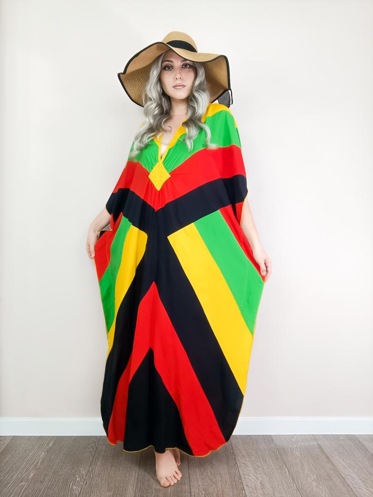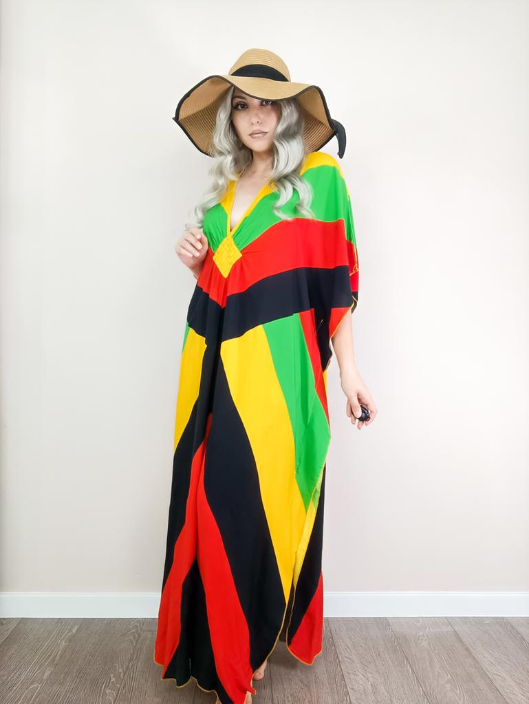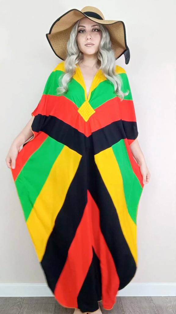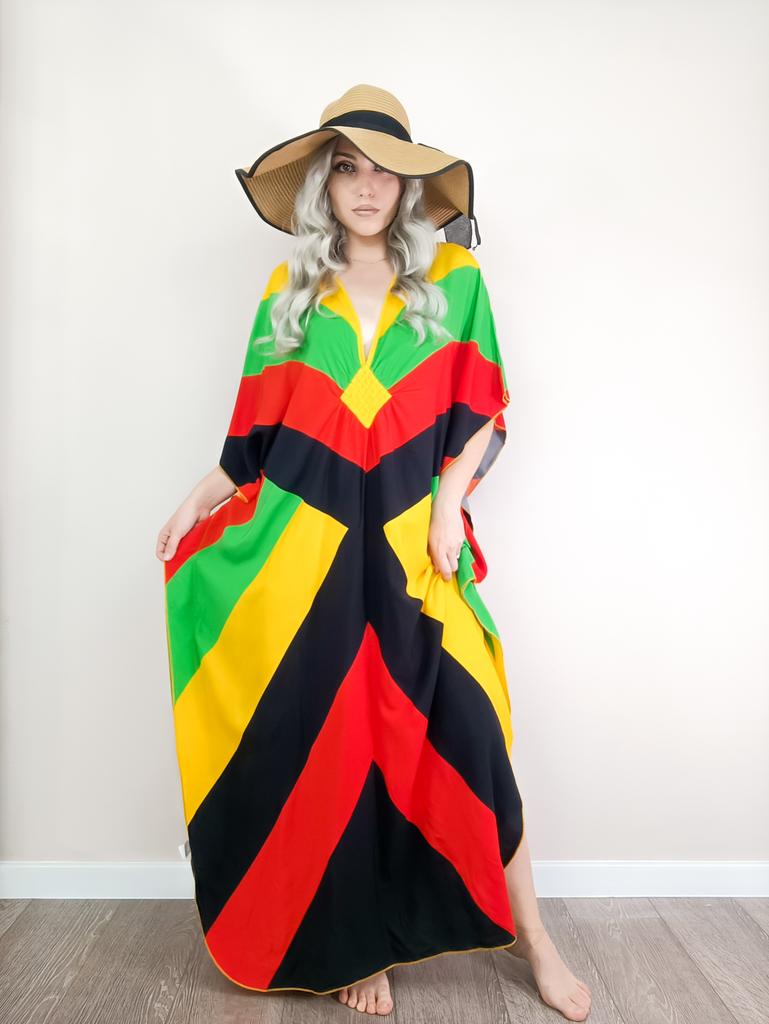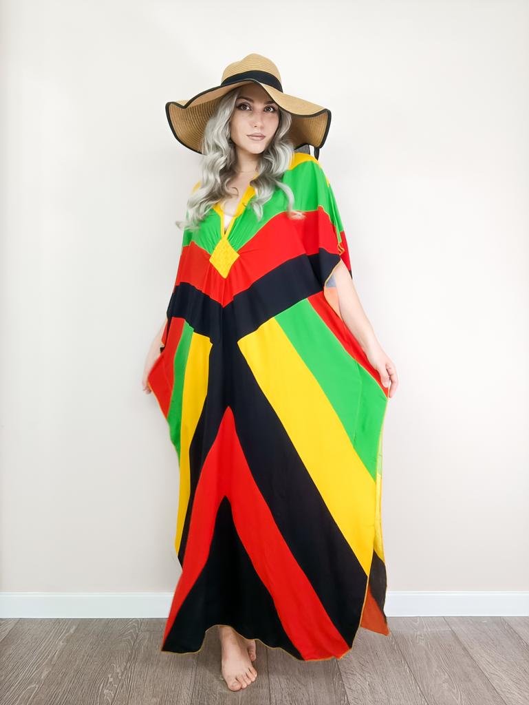 EDOLYNSA 2024 Summer Colorful Patching Sexy V Neck Batwing Sleeve Loose Maxi Dress Women Clothing Bohemian Vacation Beach Cover-ups Q1618