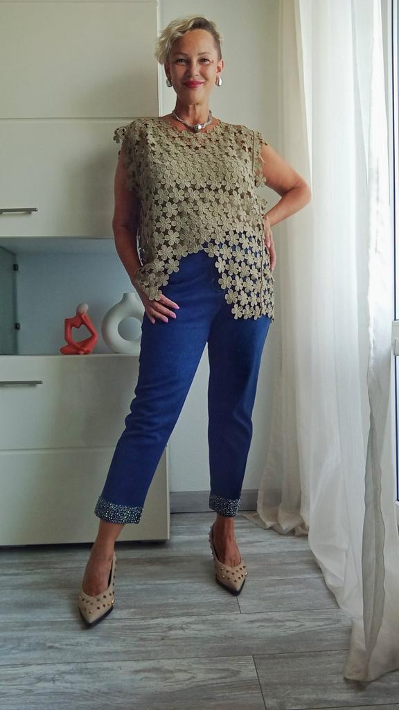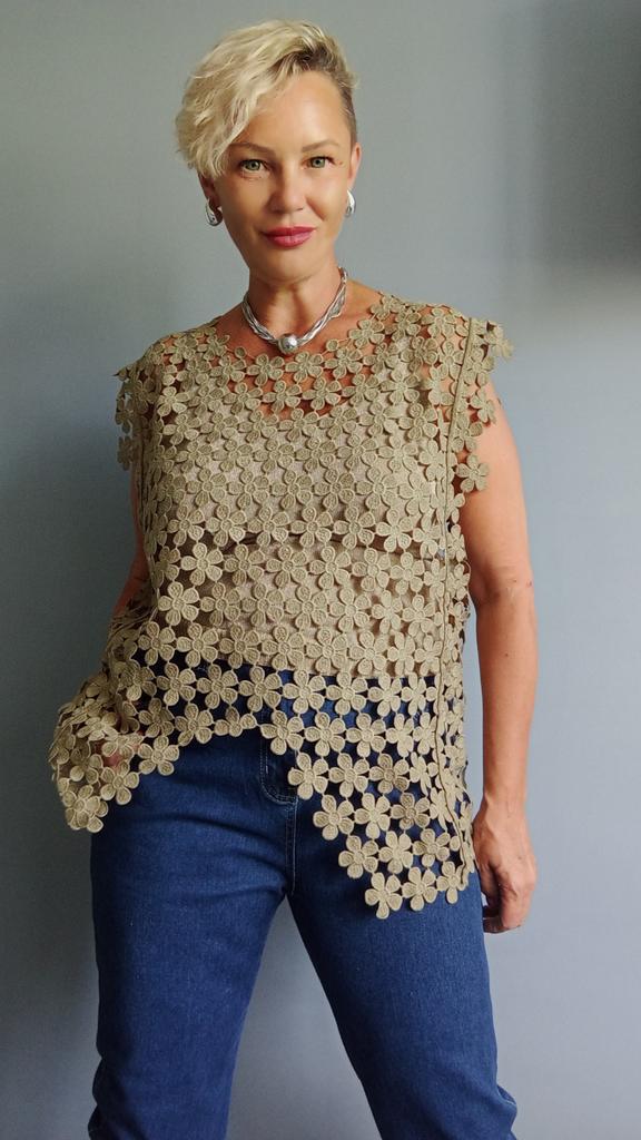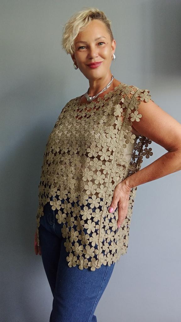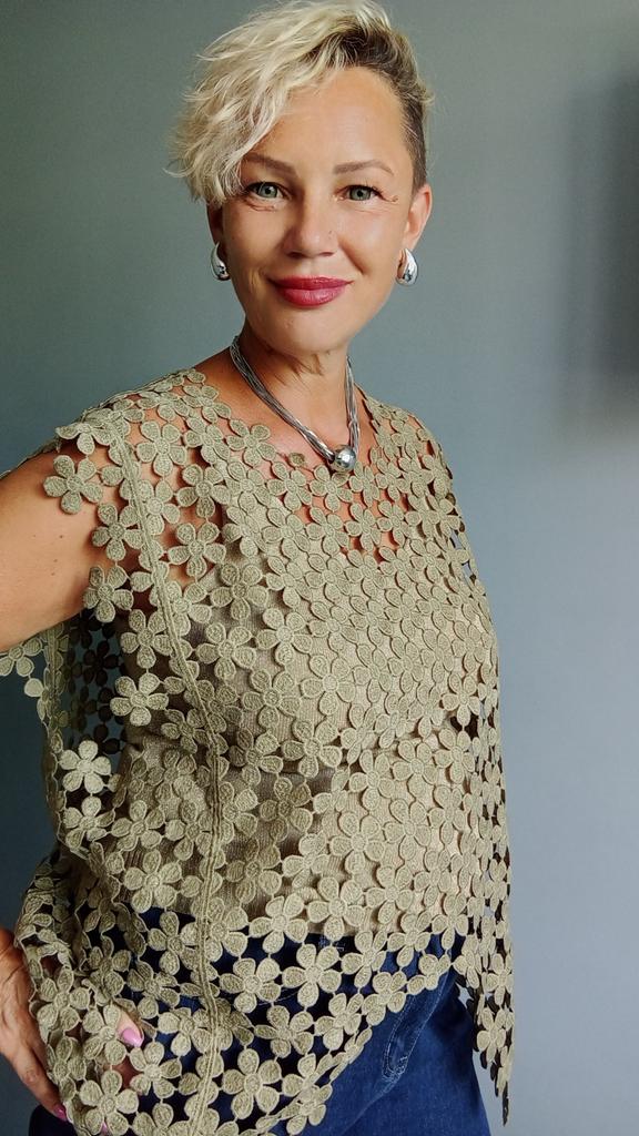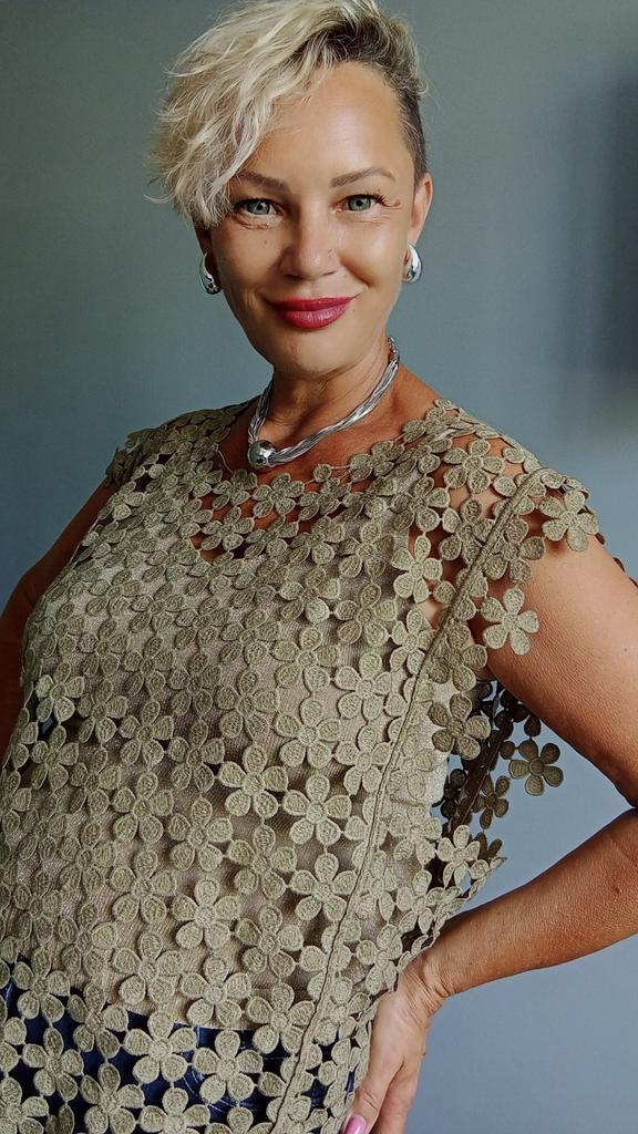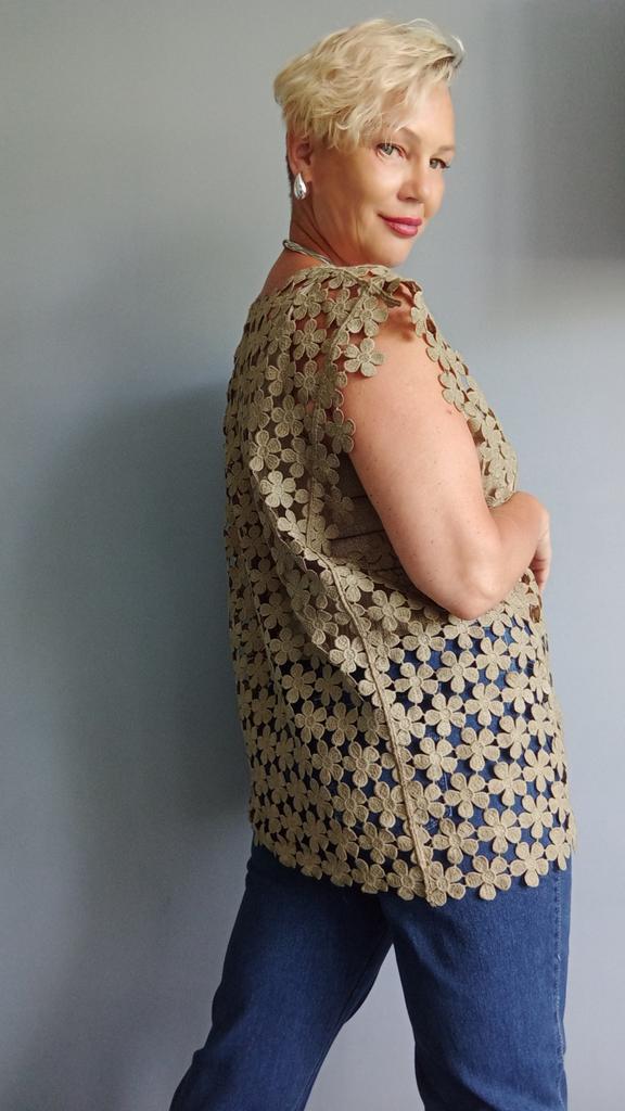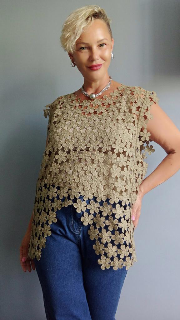 The size fit well for my parameters height 170 cm 120-113-122 . I expected the color to have a beige tint, but it is greenish. The bra is visible through the armhole, a top or tank top is needed.