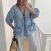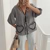 Womens Short Sleeve Casual Plaid Shirt Loose Strap Design Tops With Heart-shaped Pocket