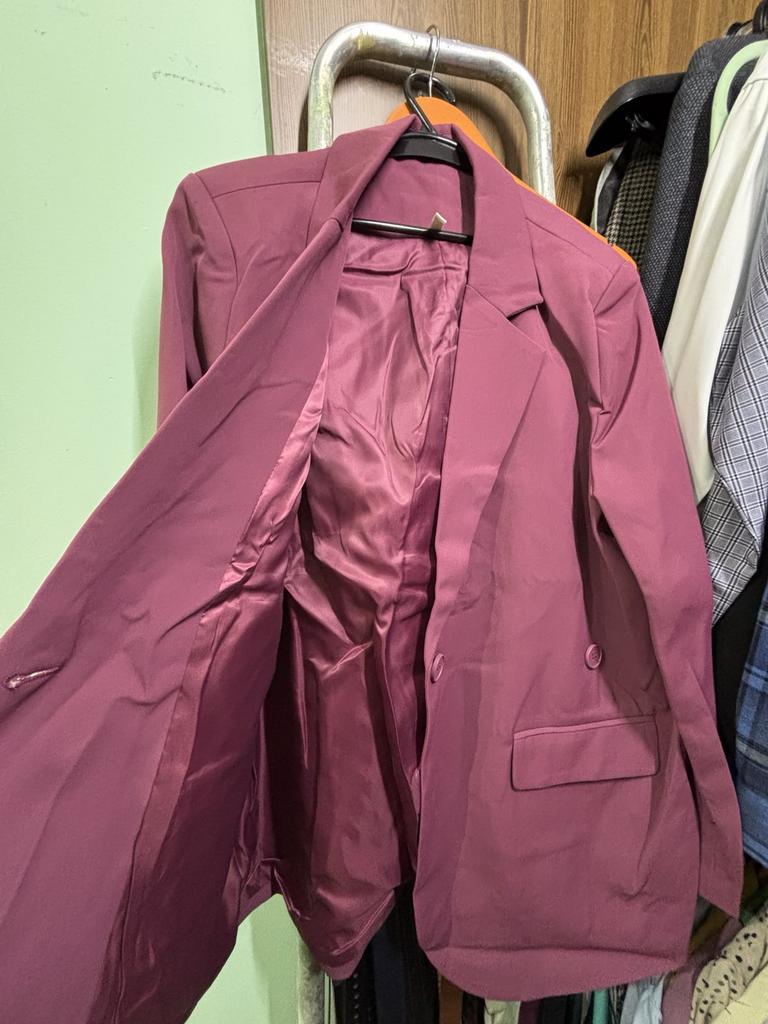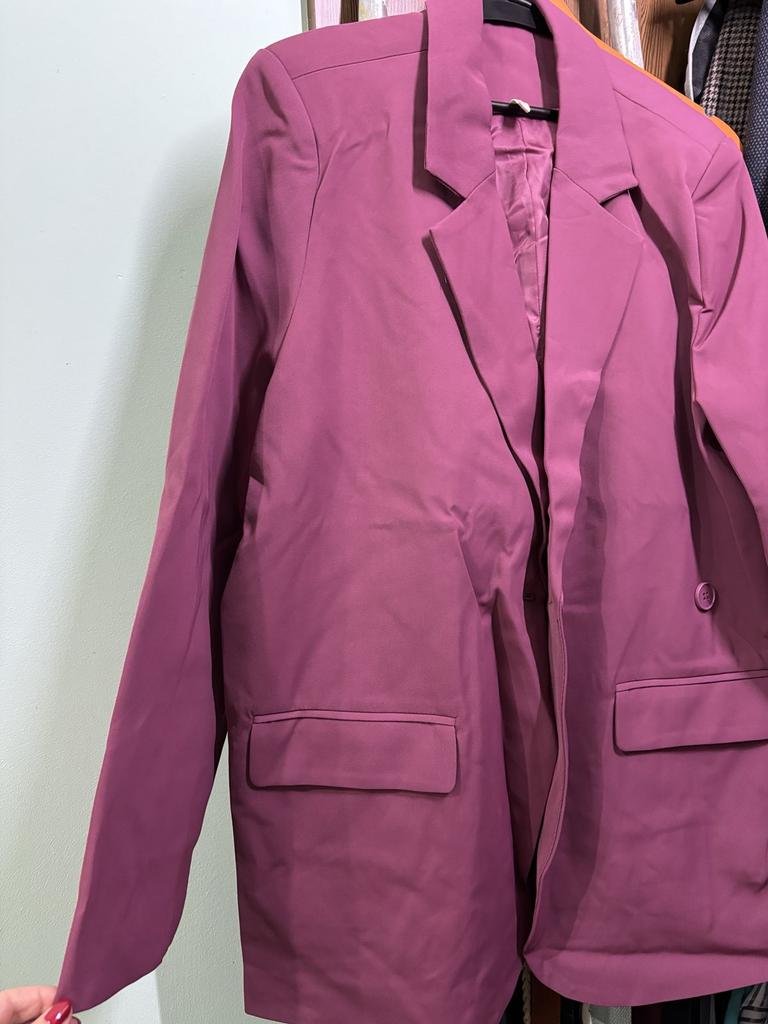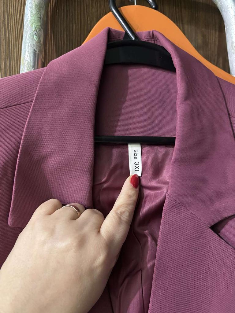 The quality of the fabric is good, even though it is 100% polyester. The color matches the one in the description. The bust circumference is 120 cm and not 124 cm as indicated in the description. The sleeve circumference is 40 cm, and for me it is small, considering that I am going to wear it with a blouse underneath. It came well packaged and contained a black hanger on which the jacket in the photo is hung.