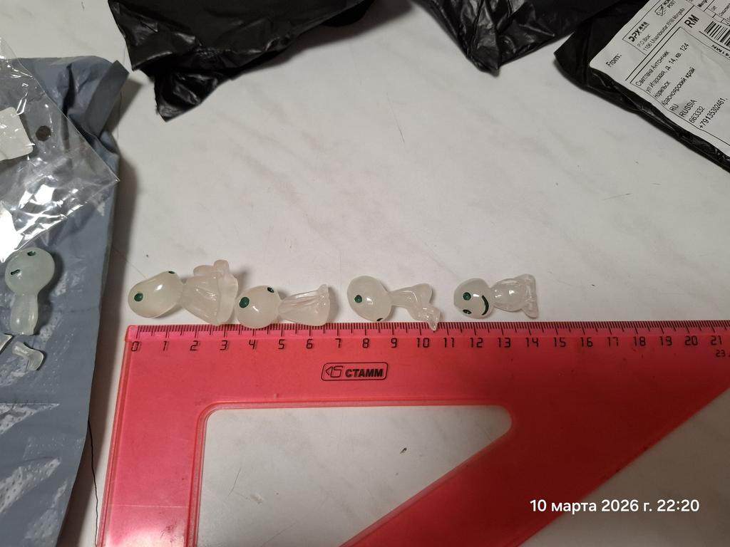 Cool, they glow. About 3cm tall. One didn't make it, its legs broke((. Each is packed in a little bag, and these bags are in a common package.