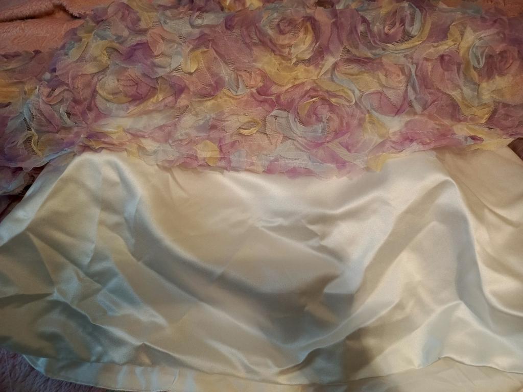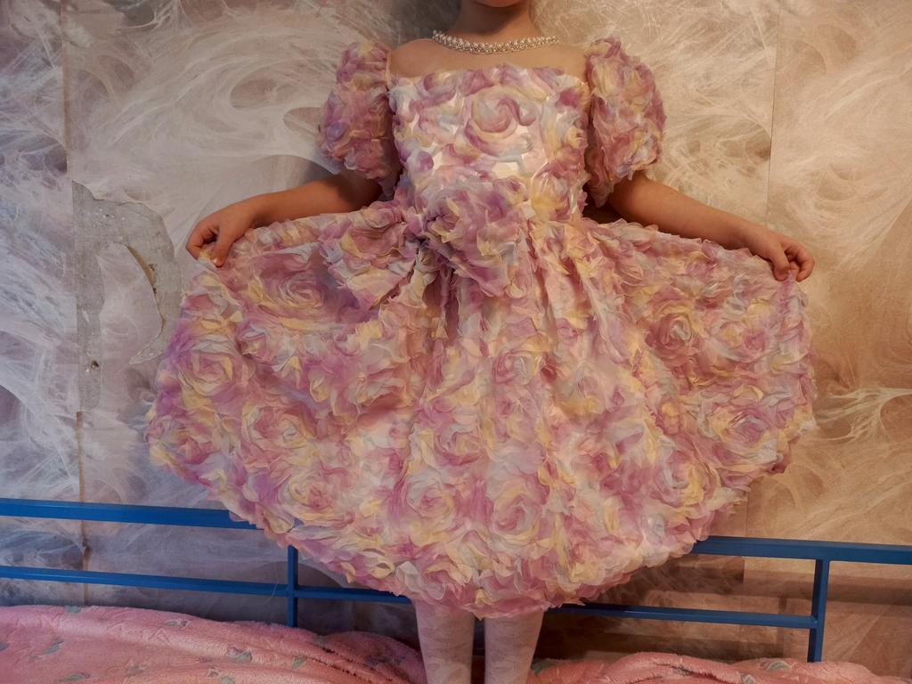 Gorgeous dress! Bought in advance for graduation. Took size 140 with a margin. For a chest circumference of 63 cm. and the current size 128-134, there is just enough margin. Very delicate airy top, the flowers are voluminous. The lining is soft, there is a built-in petticoat (i.e. you are buying a complete dress, not requiring any tricks). The bow is on a pin. It can be placed anywhere on the dress, or pinned to a hair elastic. The zipper on the back is covered with the same fabric as the dress itself. The daughter is delighted! Mom too )
