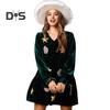 Women Christmas Dress Festive Star Print Patchwork Sequin A-line Pleated V Neck Long Sleeves Ruffles Velvet Party New Year Mini Dress