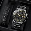 2pcs/set, Men's Fashion Stainless Steel Quartz Watch & Analog PU Leather Bracelet Set, Men's Gifts