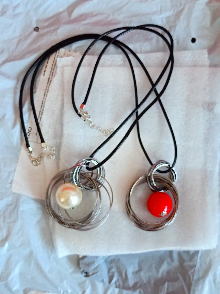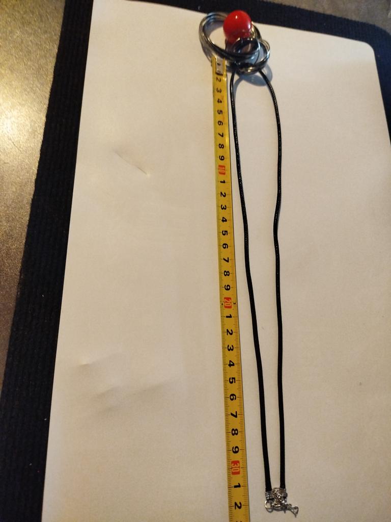 Very cool pendant, metal color is dark gray, red round pendant in the shape of a ball, the ball has weight, the cord is long and leather, cord length 32 cm + additional chain of 10 links.